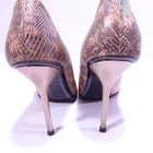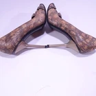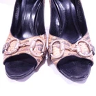 Pre Loved Gucci Faux Crocodile Leather Horsebit Gold Leather High Heel Peep Toe Pumps Size 7 Vintage and loved by me If these shoes could talk! Love them forever Here's the scoop .... Black leather lining - Slight chip in leather on left foot see photos Gucci interior signature Gold Horsebit design Metallic Gold Leather High Heel Additional RUBBER Bottoms - NYC Value 68 USD Leather bottom Gucci Made in Italy engraved bottoms