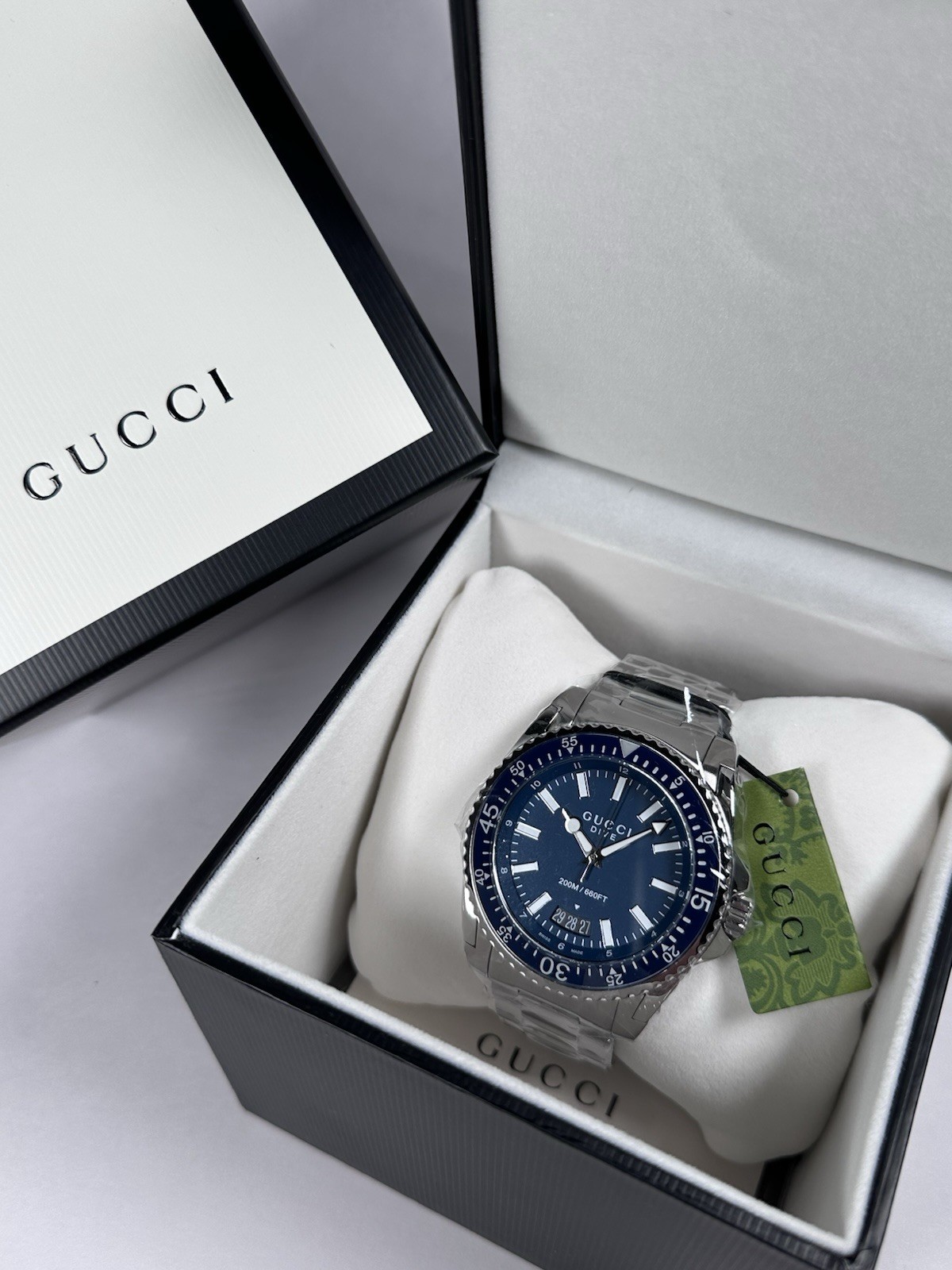 FAST 1-4 business days delivery from South Florida Product Details Case Case Thickness 12 mm Case Material Stainless Steel Case Shape Round Case Back Solid Band Band Material Stainless Steel Band Type Bracelet Band Color Silver-tone Band Length 8 inches Band Width 23 mm Clasp Fold Over with Double Push Button Dial Dial Color Blue Type Analog Crystal Scratch Resistant Sapphire Hands Silver-tone Dial Markers Index / Aracic Numeral Second Markers Minute Markers around the outer rim Luminiscence Hands and Markers Bezel Uni-directional Rotating Bezel Color Silver-tone Bezel Material Stainless Steel with in inlaid Blue Rinh Crown Pull / Push Information Brand Gucci Collection Name Dive Gender Mens Model YA136203 Watch Label Swiss Made Movement Quartz Features Water Resistance 200 meters / 660 feet Calendar Date display at the 6 o'clock position Functions Date, Hour, Minute, Second Watch Features Stainless Steel, Analog