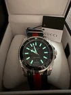 Free shipping from Miami, Florida! Delivery time 1-4 business days Product Details Case Case Size 45 Case Thickness 12 mm Case Material Stainless Steel Case Shape Round Case Back Solid Band Band Material Nylon Band Type Strap Band Color Red and Green Band Length 8 inches Band Width 22 mm Clasp Tang Dial Dial Color Black Type Analog Crystal Scratch Resistant Sapphire Hands Luminous Dial Markers Index / Arabic Numeral Second Markers Minute Markers around the outer rim Luminiscence Hands and Markers Bezel Uni-directional Rotating Bezel Color Silver-tone Bezel Material Stainless Steel with Black PVD Top Ring Crown Screw Down Information Brand Gucci Collection Name Dive Gender Mens Model YA136206 Watch Label Swiss Made Movement Quartz Features Water Resistance 200 meters / 660 feet Calendar Date display at the 6 o'clock position Functions Date, Hour, Minute, Second Watch Features Stainless Steel