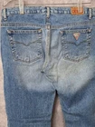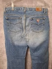 The product is a pair of authentic vintage low rise Y2K Guess jeans for women in size 30, featuring a flare style from the 90's streetwear casual fashion. Made of 100% cotton denim with a light wash, these jeans are lightweight, comfortable, and breathable. The design includes a 5-pocket design with a classic zip and button closure, showcasing the Guess logo as an accent. Perfect for various seasons, these vintage jeans are machine washable and embody a mix of nature, festival, biker, and hipster themes, making them a versatile and trendy addition to any wardrobe. Waist 32 in. Inseam 30 in. Rise 9 in. Length 39 in.