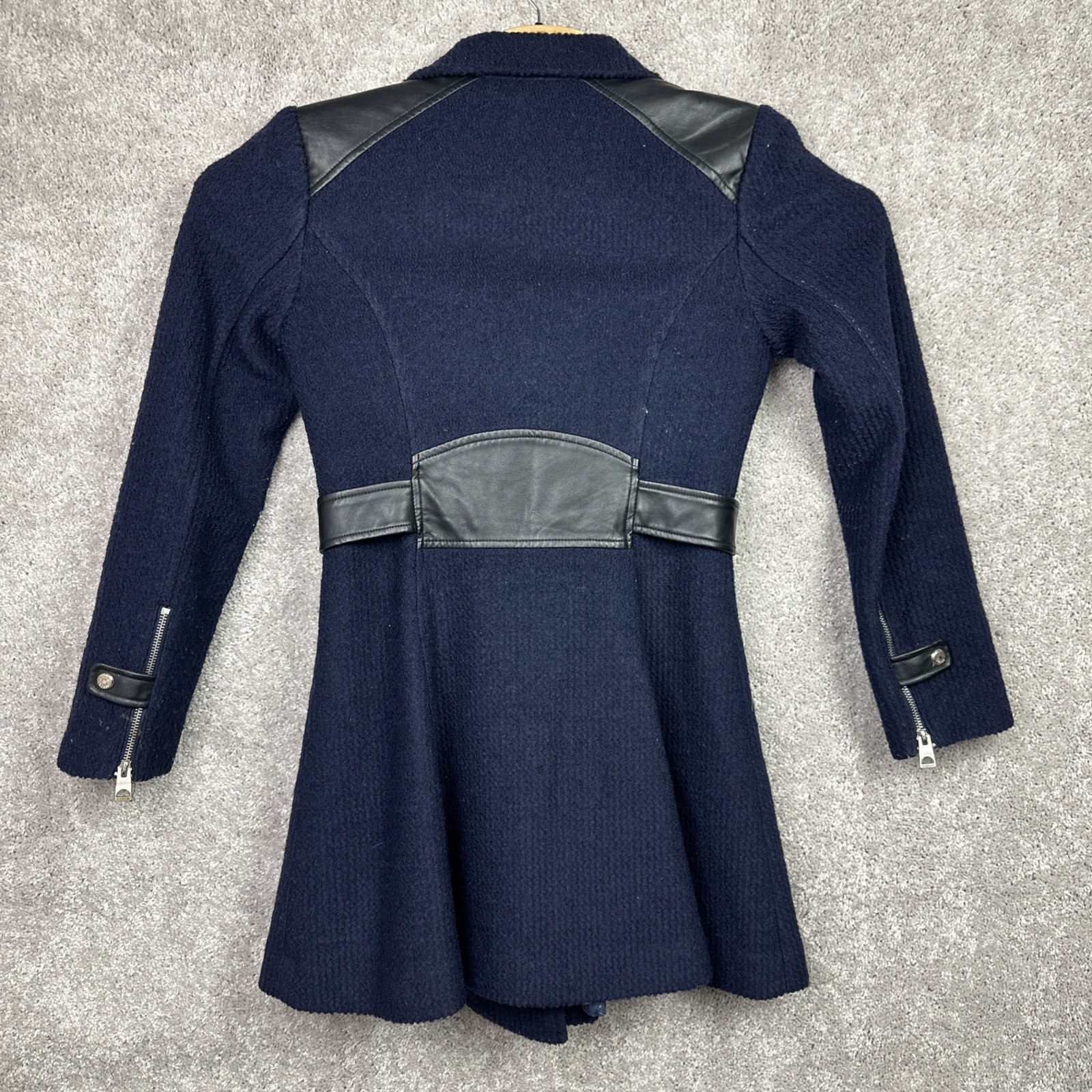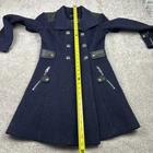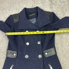 This is a GUESS Peacoat Jacket for women in size small, made from a wool blend material in a textured fabric. It features a double-breasted closure with gold buttons, zip pockets, and a tulip hem. The navy blue jacket has a formal style, long sleeves, and a mid-length fit, suitable for the winter and fall seasons. The lining is a combination of polyester and wool, ensuring warmth and comfort.