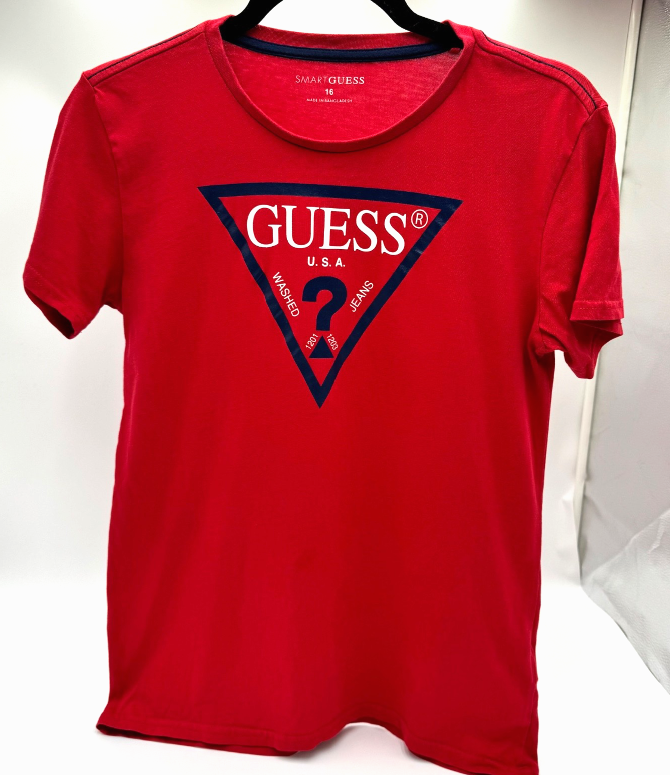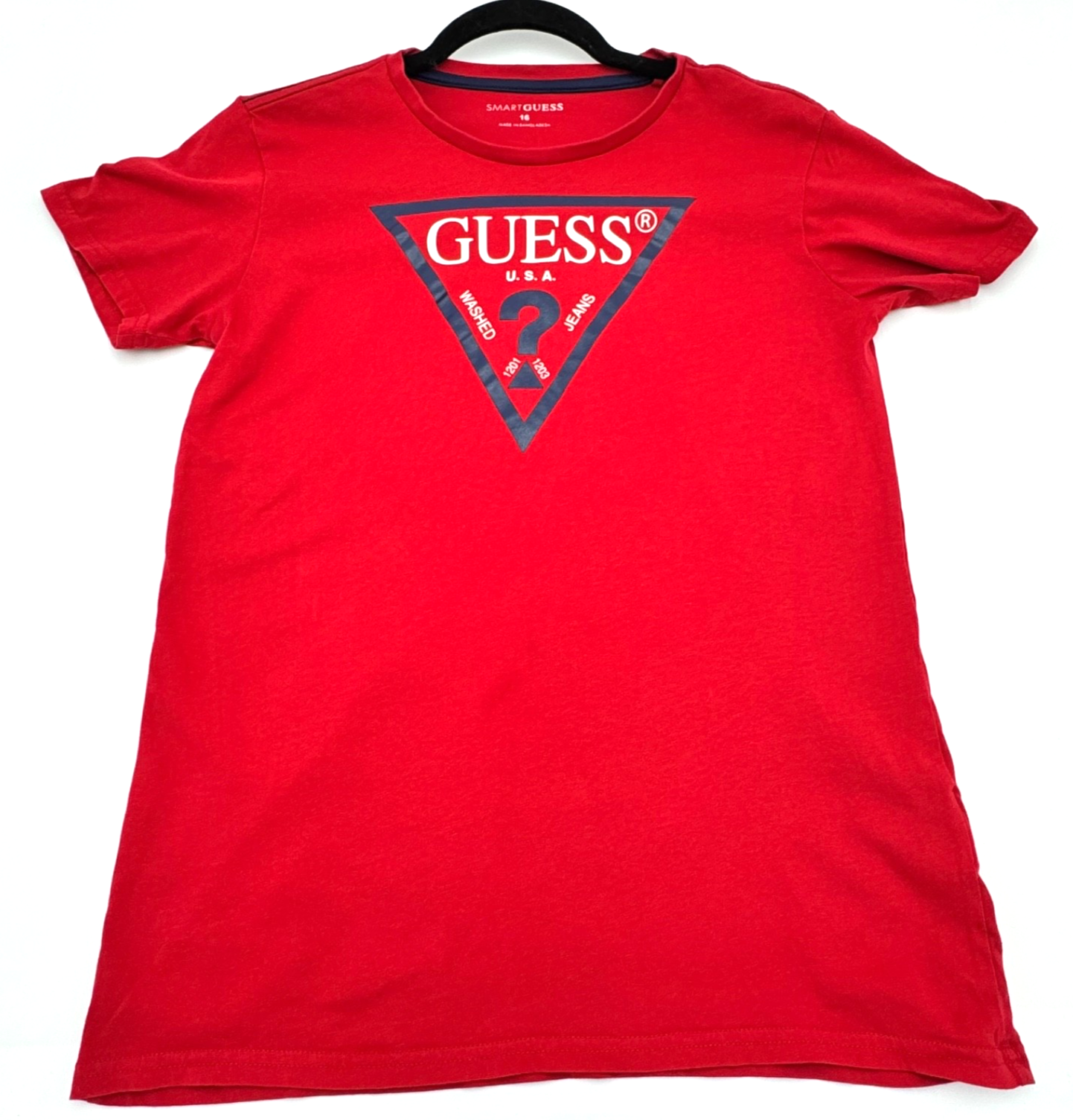 GUESS Unisex Red Triangle Logo T-Shirt Size 16 Youth / Adult Small Pre-Owned Elevate your casual style with this bold and iconic GUESS red triangle logo T-shirt , designed for both youth size 16 and adult small fit. This pre-owned tee brings brand recognition and street-ready appeal to your wardrobe at a great value. Condition: Pre-owned in excellent condition with minimal signs of wear. A subtle shoulder mark is present (visible in close-up photos), though virtually unnoticeable. • Brand: Guess (SmartGuess line) • Size: 16 (Unisex) • Design: Iconic Guess triangle logo in navy and white on bold red fabric • Neckline: Crew Neck • Sleeves: Short Sleeve • Material: 100% cotton jersey for breathable, comfortable wear Perfect for layering under jackets, pairing with jeans or skirts, or adding a pop of retro style to any casual outfit. Care instructions: Machine wash cold inside out. Ships promptly from a smoke-free, pet-free home. Picture in this listing correspond to the product you are getting. We shoot them in our studio, please see the pictures for more details and allow some differences in color because of the light we use in our studio. At Gianna Clare Store we care 100% about your satisfaction. If you encounter any issues or if something doesn't meet your expectations, we kindly ask you to contact us through the " Ebay - Ask Seller A Question " before leaving negative feedback. We are committed to resolving any problems as quickly as possible and ensuring you have a positive experience with us. Your feedback is very important to us, and we will do everything we can to assist you. Shipping: We ship Monday to Friday. Returns: Please read the item description before buying. We only accept returns if the product doesn't correspond to the description. If yours, is a special case please contact us beforehand so we can give you an appropriate solution. Thank you for shopping and trusting us!