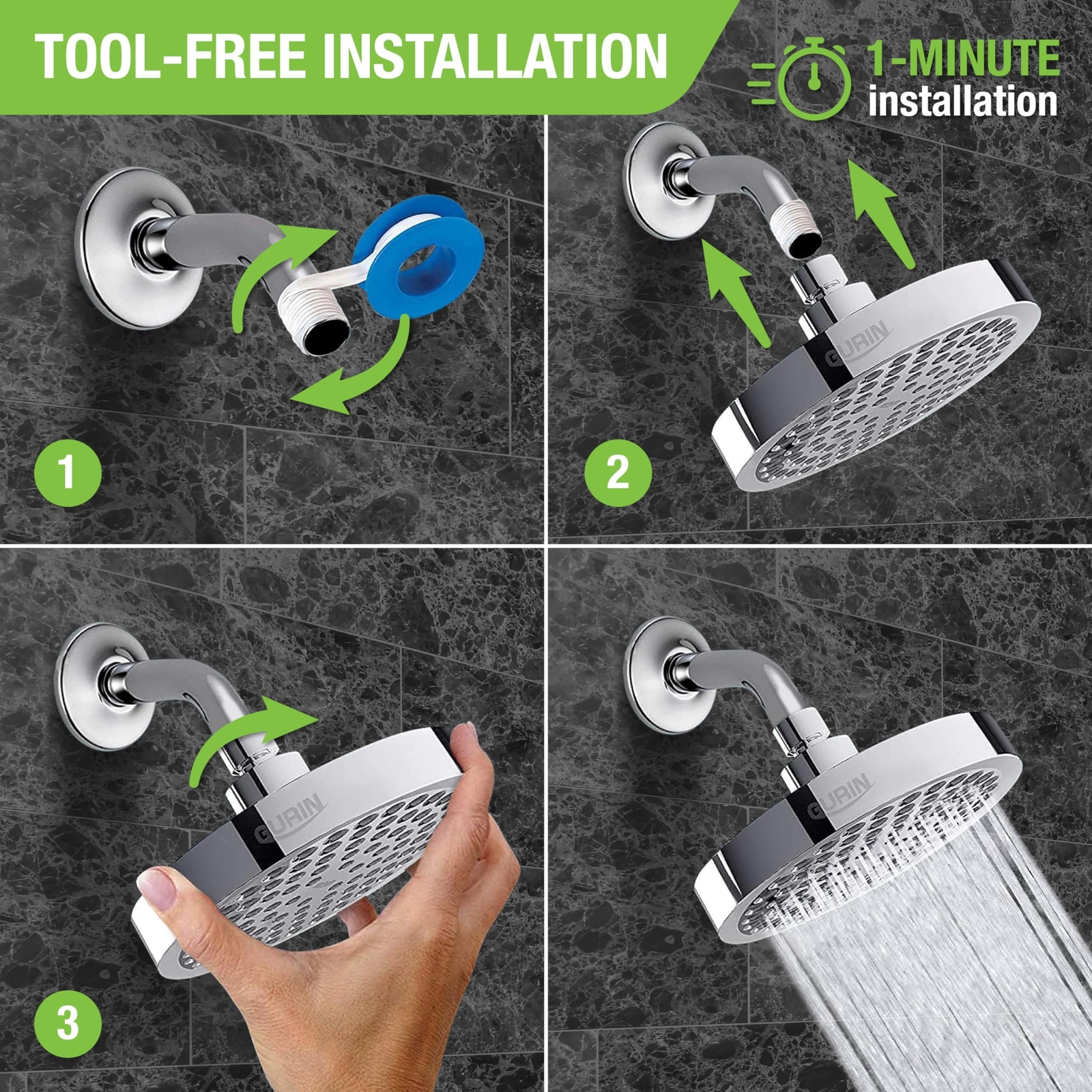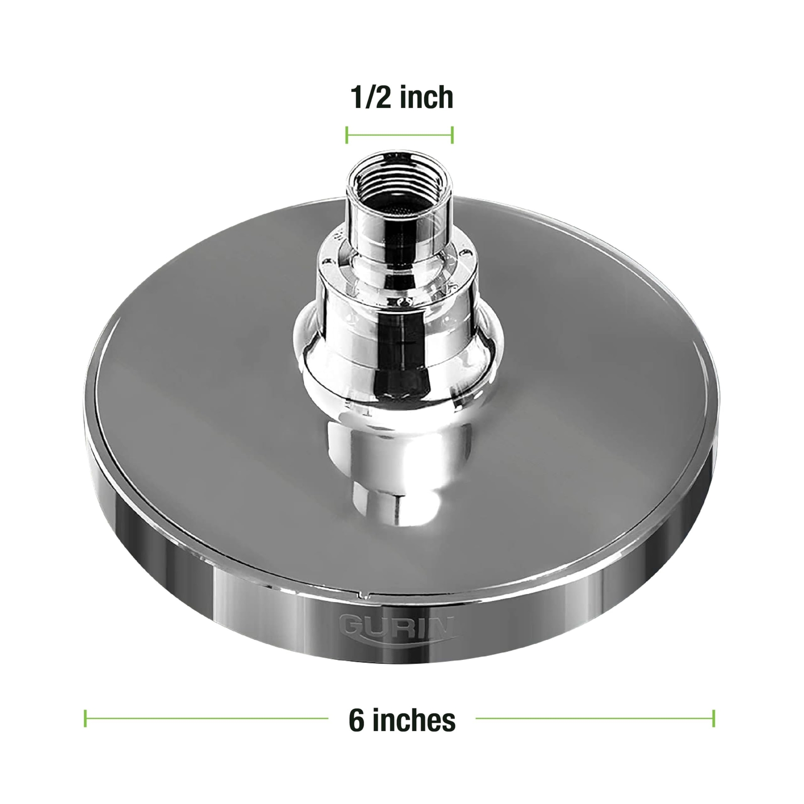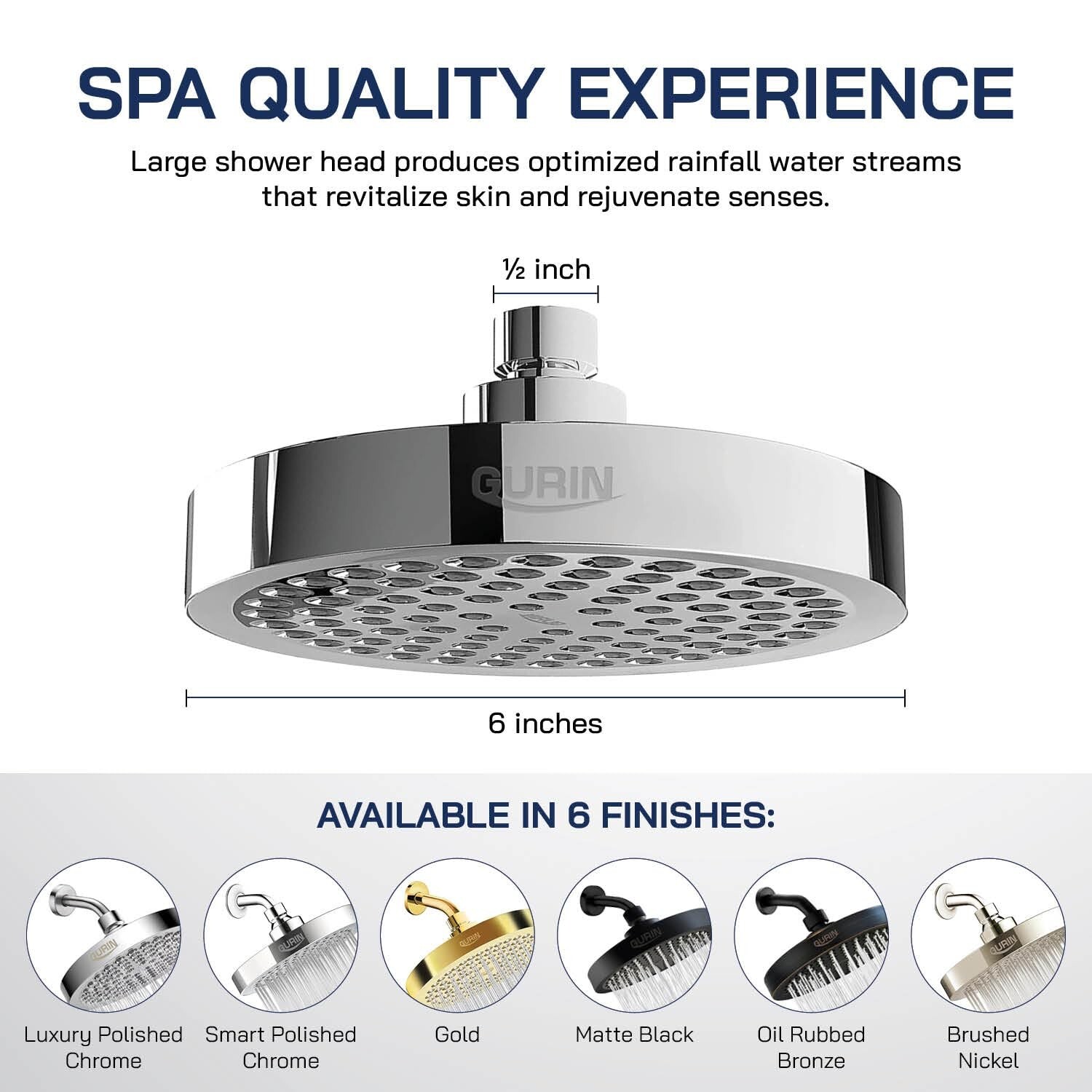 GURIN Shower Head High Pressure Rain, Luxury Bathroom Showerhead with Chrome Plated Finish, Adjustable Angles, Anti-Clogging Silicone Nozzles (2.5 GPM) Product Details Color: Smart Polished Chrome Brand: GURIN MPN: GP-ULTSHHEAD UPC: 858759005728 EAN: 9554440571909 Brand: GURIN Style: Adjustable Shape: Round Material: Acrylonitrile Butadiene Styrene Finish Type: Chrome Brand: GURIN Style: Adjustable Shape: Round Material: Acrylonitrile Butadiene Styrene Finish Type: Chrome Setting Type: full body, rain Installation Type: Wall Mounted Color: Smart Polished Chrome Product Dimensions: 6.9"L x 6.4"W Hose Length: 6 Inches Number of settings: 1 Number of Jets: 90 Efficiency: High Special Feature: Anti-clogging silicone nozzles, adjustable angles, high-pressure rain showerhead, bonus Teflon tape and additional water filter UPC: 858759005728 Manufacturer: Gurin Part Number: GP-ULTSHHEAD Item Weight: 11.6 ounces Country of Origin: China Item model number: ULTSHHEAD Size: 2.5 GPM - 6 Inch Round Finish: Chrome Pattern: Modern Chrome Item Package Quantity: 1 Flow Rate: 2.5 Gallons Per Minute Special Features: Anti-clogging silicone nozzles, adjustable angles, high-pressure rain showerhead, bonus Teflon tape and additional water filter Included Components: washer, Teflon tape, Water flow restrictor Batteries Included?: No Batteries Required?: No Date First Available: December 26, 2019 LUXURY RAINFALL SHOWER HEAD - Offering a spa-quality experience in the comfort of your own bathroom this large shower head produces optimized water streams in a full deluge of rain fall that revitalizes your skin and rejuvenates the senses. RELAXING, HIGH-PRESSURE CLEAN - A luxury design that uses anti-clogging silicone jets to push out water faster and more efficiently, our showerhead helps wash away soap, shampoo, and conditioner with less effort and without irritating skin. ANTI-CLOGGING, EASY-SELF CLEAN NOZZLES - Great for those who suffer from hard water or limescale our bathroom high pressure shower head features 90 anti-clog silicone nozzles that offer consistent reliability, so you can focus on washing away the dirt and impurities. Our Shower heads high pressure beats expensive shower head in quality and durability, it brings rain shower like no others. QUICK, ADJUSTABLE ANGLES & WATER SAVINGS -Along with being easier to install our Gurin showerhead rainfall system can be turned left or right, or up and down, to help you clean off your hair and body easily or cleaning up your kids after playing outside. Gurin Rainfall Shower Head has a maximum outflow of 2.5 GPM, so you can save on your water bill. Universal Showerhead Replacement/Extra Bonus - An easy twist-on system that lets you quickly replace a filtered, angled, or standard shower heads, the Gurin waterfall showerhead / shower head high pressure works with almost any existing showering plumbing setup. Comes with a bonus-FREE Teflon tape+additional water filter so you can install your rain shower head effortlessly and quickly.
