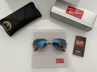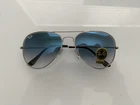 Little white logo slightly smudged. See pictures. Ray-Ban's iconic Aviator Sunglasses RB3025 in Silver and Light Blue are a sleek and stylish accessory for any outfit. Made with a sturdy metal frame, these sunglasses feature the classic Aviator style with a modern twist. Perfect for both casual and formal occasions, these sunglasses are a must-have for any fashion-forward individual looking to make a statement.