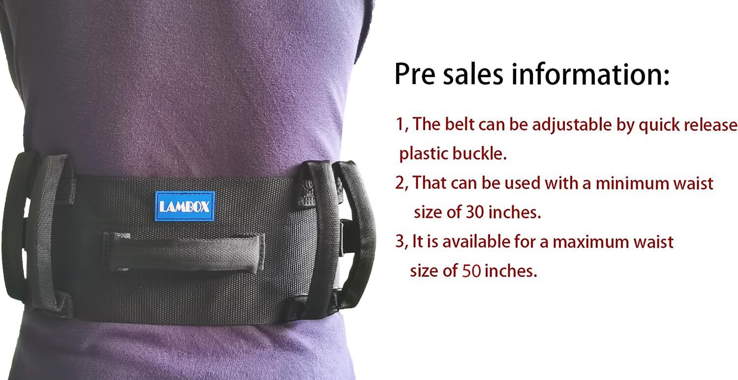 Gait Belt-Transfer Belt with 7 Nylon Padded Handles, Medical Nursing Safety G... ✅SEVEN COMFORTABLE FOAM HANDLES — The gait belt with high quality foam handles, Each of the 7 handles on our Transfer Belt are fitted with a soft comfortable as caregiver pulls to provide assistance. The multiple nylon straps aren’t fixed in one position, allowing the caregiver to hold and pull on the straps ALL sides. ✅STRONGER QUALITY WEBBINGS AND STITCHINGS: The Transfer Gait Belt made of strong nylon webbing with high quality stitchings, 5 inch wide pad 29-30 inch as back support. ✅EASY TO USE/TAKE OFF: To choose suitable for your waist size, the total length about 60", that can be adjusted size 30-50" ,It means that the minimum suitable waist size is 30 inches and the maximum suitable waist size is 50 inches. Need leave some rest size for adjustment. If the waist size you want to use is not in our range, please choose a better size. ✅GREAT FOR HOME CARE, designed to transfer by caregivers,which is easy to HOLD by multi handles at 4 sides. ✅ENSURE TO USE, PLEASE ADJUST FIT WAIST SIZE AND CHECKING QUALITY BUCKLE IN ADVANCE Shipping We offer FREE shipping on all orders! We ship within Three business days of payment, usually sooner. We use a selection of shipping services such as UPS, FedEx, USPS etc. We only ship to the lower 48 states, no APO/FPO addresses or PO Boxes allowed. Local pickups and combined shipping options are not provided at this time. Return You can return a product for up to 30 days from the date you purchased it. Any product you return must be in the same condition you received it and in the original packaging. Please keep the receipt. Payment We accept payment by any of the following methods: PayPal Please pay as soon as possible after winning an auction, as that will allow us to post your item to you sooner! Feedback Customer satisfaction is very important to us. If you have any problem with your order, please contact us and we will do our best to make you satisfied. Contact Us If you have any queries, please contact us via ebay. We usually respond within 24 hours on weekdays. Please visit our eBay store to check out other items for sale! Thank you for shopping at our store.