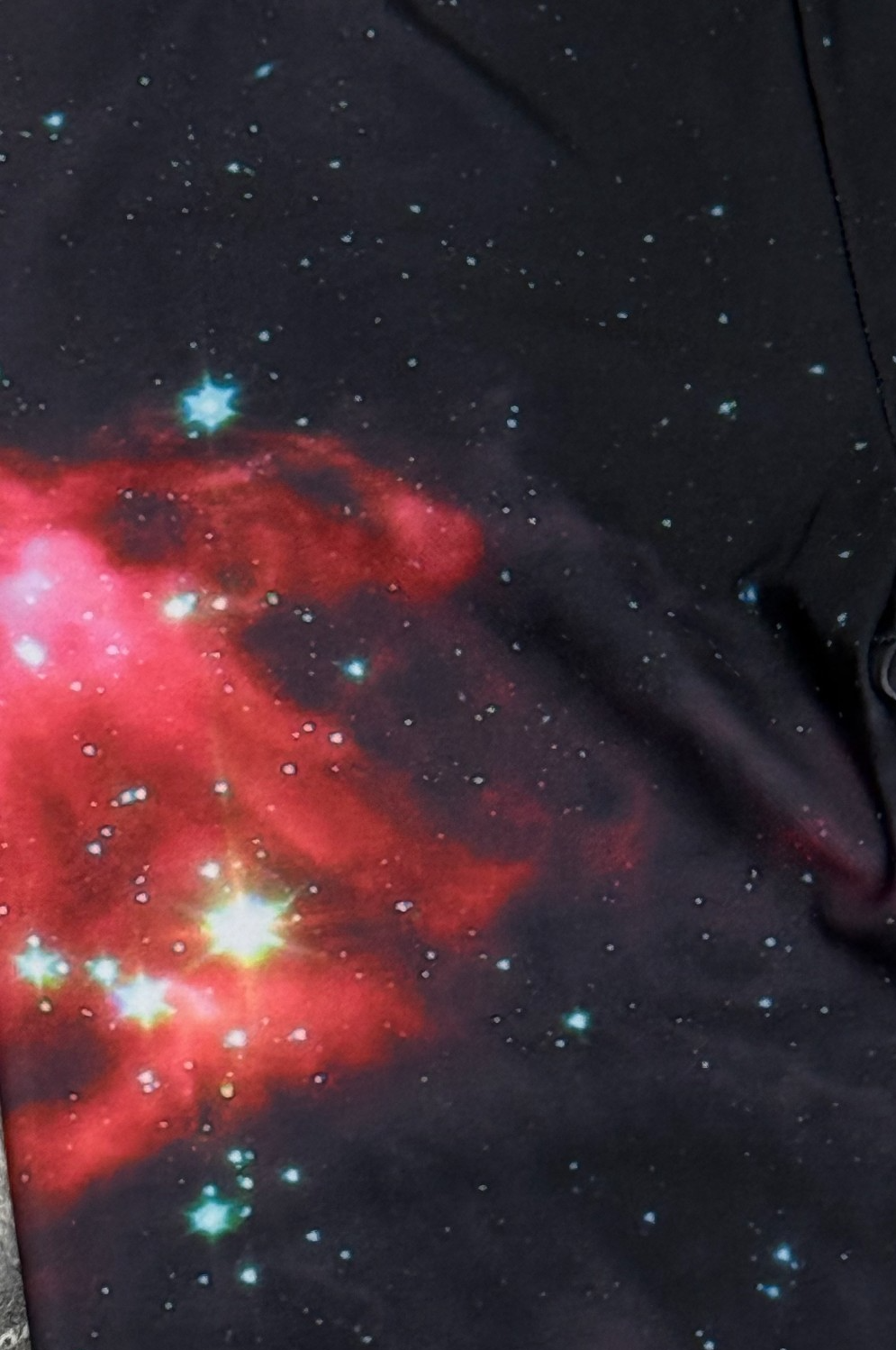 Galaxy Star leggings in cosmic print of a red sky with white and blue stars on a dark purple background. Mid-rise, elastic waist, ankle length in a stretchy fabric. Excellent condition, appear unworn with all tags removed. Bold pants perfect for bonfire nights, festivals, relaxing, and casual weekends. Waist 26 Rise 9 including Elastic Waistband 1 Hips 32 Inseam 28 inches - sizing based on measurements. Material based on same item.