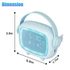 Product Feature ⏰ Sleep Trainer Clock: Sufficient and regular sleep helps children grow taller and strengthen their physique. With this kids alarm clock, it is easy for parents to teach their young children to have regular sleep-wake habits . It also can be a night light , 3 level brightness to choose. ⏰ Sunrise & Sunset Light: Set your sunrise time , the light will gradually get brighter from 10% to 100%. While the sunset simulation is the opposite, the sunset light will gently dim from current brightness to completely black out. ⏰ Multifunction Display: The alarm clock can display time, alarm, month, date, year . Temperature display reminds you of temperature changes, add or remove clothes in time to prevent colds. The countdown function can help to plan the children's homework time, game time, and your cooking time. ⏰ Dual Alarm & Snooze : Dual alarm that can be set simultaneously, 3 wake-up date modes: Monday-Friday, Monday-Saturday, and Monday-Sunday to help you arrange your life more efficiently. Press the Snooze button, kids can get an extra 5 mins nap. ⏰ Voice Sensor & Soothing Light : If only use the battery powered , the kids alarm clock will enter sound sensor mode. It will be wake up for 20s when the surrounding is louder than 56 dB. We can wake up it by clapping, tapping, and speaking. The Night Light protect children's eyes and offer a comfortable glow for children of all ages. This cute alarm clock Ponyo is soft to touch, safe for kids, especially suitable to be a Christmas, New Year, Birthday gift to your boy or girl. Product Specification Color Blue Material ABS and PC silincone Signal Format Digital Time Screen 12 Hour/24 Hour mode Snooze Alarm Clock Yes Ringtone types 6 Power supply Built-in 1200mah lithium battery Dimensions 5.0*3.5*1.7 inch Package Included 👒 Alarm Clock x 1 👒 User Manual x 1 👒 USB cable x 1 Location Descriptions To improve your buying experience and ensure fast delivery, Your order will be shipped from the warehouse located in either new jersey or california that is closest to your address. If you have any questions, Please contact us. Thank you for your support ! Support & Share