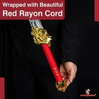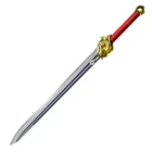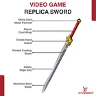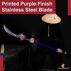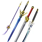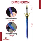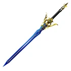 Freedom-Sworn Sword Overall Length: 45.25 inches, Blade Length: 27 inches, Handle Length: 12 inches, Video Game Replica Sword, Stainless Steel Blade, Printed Blue Finish, Wooden Handle, Gold Zinc Alloy Finish, Faux Jewel Accents. Lion's Roar Sword Overall Length: 37.25 inches, Blade Length: 24.5 inches, Handle Length: 9.75 inches, Video Game Replica Sword, Stainless Steel Blade, Printed Finish, Wooden Handle, Red Rayon Wrapping, Gold Zinc Alloy Fittings Akuoumaru Sword Overall Length: 43 inches, Blade Length: 23.5 inches, Handle Length: 12 inches, Video Game Replica Sword, Stainless Steel Blade, Printed Finish, Wooden Handle, Faux Rayskin Cover, Black Rayon Wrapping, Gold/White Zinc Alloy Fittings Engulfing Lightning Sword Overall Length: 69 inches, Blade Length: 16 inches, Handle Length: 49 inches, Video Game Replica Naginata, Stainless Steel Blade, Printed Purple Finish, Factory Edge, Aluminum Handle, Gold Zinc Alloy Fittings, Faux Pearl Accents Replicated from the 5-star polearm obtained through weapon event wishes, this naginata is made to look as though it came straight from the popular action roleplay video game Genshin Impact. The blade is constructed of stainless steel with a factory edge and has a printed coating to perfectly duplicate the beautiful purple blade in the game. The handle is made from aluminum with a vibrant purple finish and gold zinc alloy fittings. The handle comes in two pieces which easily screw together to create this near 70-inch weapon. The ornate guard is also made from zinc alloy in a pinwheel design with a gorgeous golden sheen. Light pearls are inlayed in the guard for even more elaborate detail. Now you can bring home this legendary piece for your collectio