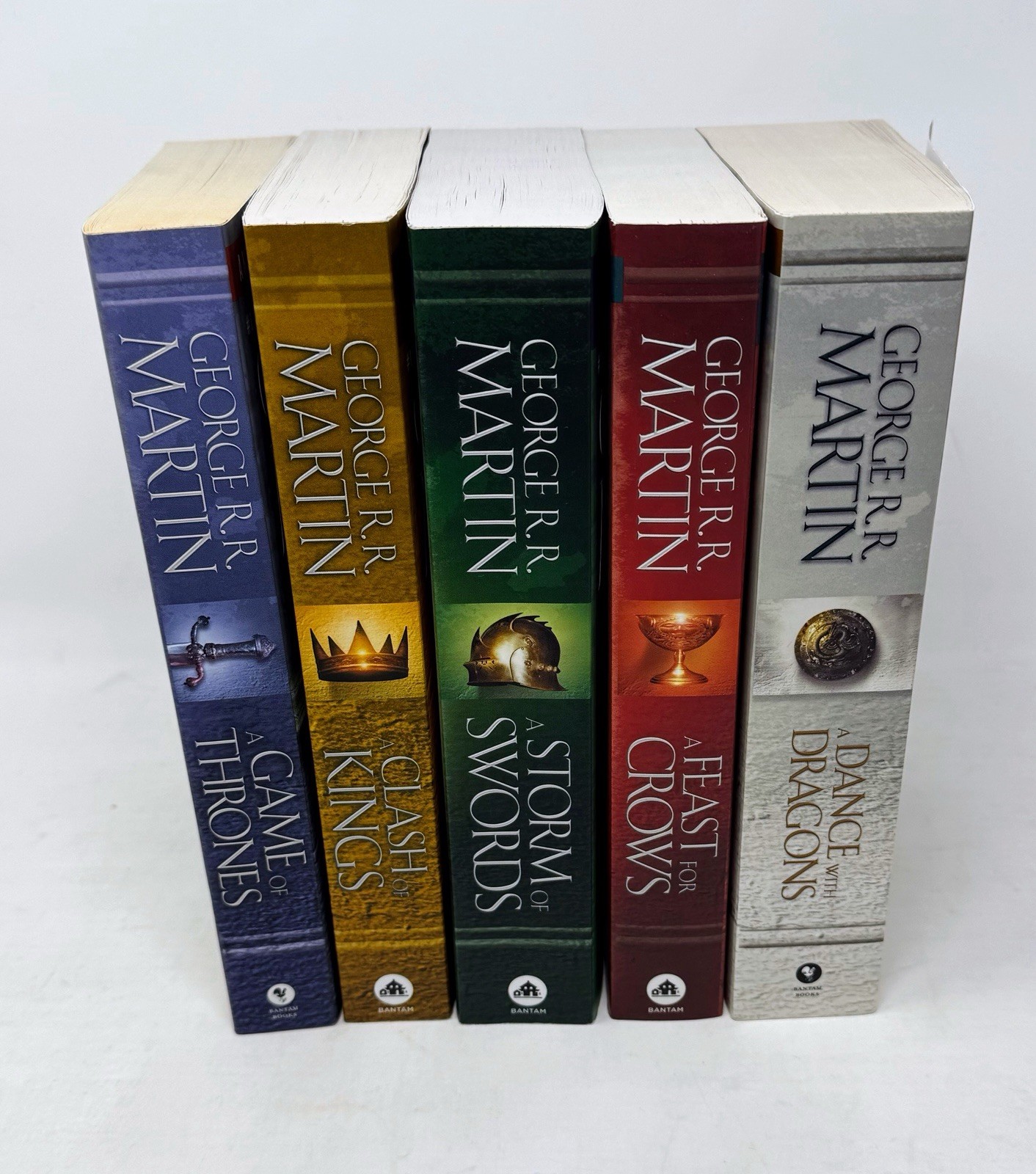 A Song of Ice & Fire 5-Book Set – George R.R. Martin PB Bantam VG ⸻ Description Build your fantasy shelf with this matching A Song of Ice and Fire 5-book set by George R.R. Martin (Bantam mass-market paperbacks). Great for reading or gifting. Included (Books 1–5): 1. A Game of Thrones 2. A Clash of Kings 3. A Storm of Swords 4. A Feast for Crows 5. A Dance with Dragons Features • Bantam mass-market paperbacks • Uniform design/spines for clean shelf appeal • Non-smoking home; stored and shipped with care Detailed Condition Notes • Covers: light gloss wear and corner tips touched; no major creases • Spines: firm; light reading lines only • Textblocks: clean; normal, even toning; no remainder marks, minor dog ears. Game of Thrones book set, GRRM paperback lot, fantasy series, Bantam books, complete to book five, ASoIaF 5 volume set, TV tie-in, dragons, medieval fantasy