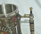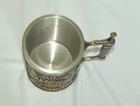 Consume your beverage of choice in style with this heavy Game of Thrones stein. Weighs over 1 lb with a felt lined bottom. The stainless steel insert can be removed for easy cleaning. Features the Game of Thrones logo over the Iron Throne on two sides and 3 house sigils - Targaryen, Stark, & Lannister. Stein measures approximately 5.5" high x 3.75 deep x 6" wide (with handle). Interior diameter of the aluminum insert is 3". Pre-owned condition with no scratches or dents HOWEVER PLEASE NOTE THAT THE SWORD HANDLE IS PARTIALLY BROKEN! One half of the cross-guard (the part on the handle before the "blade") is missing. Officially licensed Game of Thrones Merchandise. Highly-detailed Game of Thrones Iron Throne sculpted design. Painstakingly hand-painted. Removable stainless-steel insert. Product Description In the Game of Thrones, you either drink to victory or you don t live long enough to pour. Created by alternative brand Nemesis Now, this officially licensed Tankard is cast in the highest quality resin before being painstakingly hand-painted. The handle of the Tankard is a sword being slid out of its sheath, ready to strike. Each side bears a fantastically detailed raised picture of the Iron Throne, with the Game of Thrones logo in the centre. These are separated from each other and the handle by unsheathed swords pointing downwards, each with a house Sigel above it ‐ Lannister, Targaryen or Stark. With a removable stainless-steel insert for ease of cleaning, this Tankard is fit for any claimant to the throne of Westeros.