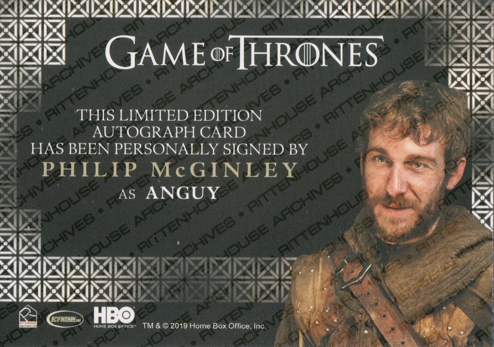 GAME OF THRONES - THE COMPLETE SERIES (RITTENHOUSE) Philip McGinley (Anguy) Autograph Card The card in the photo is of the actual card you will receive unless otherwise stated. Cards are in Mint / Near Mint Condition. All cards will be shipped in protective packaging. UK Shipping - Free Postage International Shipping - Costs charged via Global Shipping Program For combined purchases please checkout all items at the same time