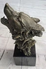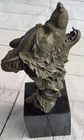 Condition : This sculpture is in perfect condition Bronze Dimensions with Marble Base: Height 12.5" X Width 7" Marble Dimensions:4" X 4" Height without base:9" Weight:11 LBS Inventory:78YDW1094487 Experience the untamed beauty and dignified presence of the wolf with this captivating bronze sculpture. The sculpture's base, resembling a winding tree trunk, gracefully transforms into a mesmerizing bust of a wolf's head. The piercing yet contemplative eyes of the wolf exude power and wisdom, inviting you to explore the depths of its enigmatic nature. Wolves, often misunderstood, possess a remarkable balance of qualities. While tales of their cunning prevail, they are also known for their social nature, intelligence, and loyalty. These free-spirited creatures navigate the world with a sense of organization and unity within their packs. Symbolically, the wolf represents various attributes such as perseverance, intuition, learning, and the pathfinder, making it a profound and meaningful symbol. Crafted with meticulous attention to detail, this 100% bronze sculpture is a testament to the artist's skill and dedication. The ancient lost-wax casting method, employed in its creation, ensures the finest quality and captures every intricate feature. Adorned with a rich brown patina finish, the sculpture radiates warmth and depth. It is elegantly displayed atop a black, variegated marble base, enhancing its overall aesthetic appeal and providing a sturdy foundation for its profound symbolism. This exquisite sculpture, signed by the esteemed artist M. Lopez, is not only a remarkable work of art but also a powerful statement. Whether displayed in your home or office, it serves as a reminder of the wolf's enduring spirit and the meaningful qualities it embodies. Embrace the mystique of the wolf and add a touch of grace and symbolism to your space with this remarkable bronze sculpture. Holwing Wolf Head Bust Bronze Metal Statue Sculpture Figure on Marble Base Signed 12.5\" x 7\" YDW-109 Video will open in a new window Using the eBay App? Paste link into a browser window: [isdntekvideo]