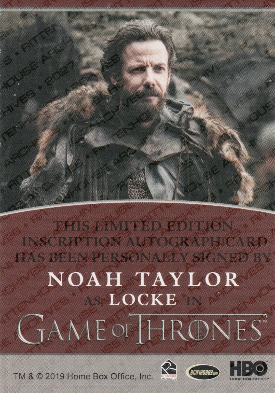 GAME OF THRONES - IRON ANNIVERSARY SERIES 1 (RITTENHOUSE) Noah Taylor (Locke) Inscription Autograph Card The card in the photo is of the actual card you will receive unless otherwise stated. Cards are in Mint / Near Mint Condition. All cards will be shipped in protective packaging. UK Shipping - Free Postage International Shipping - Costs charged via Global Shipping Program For combined purchases please checkout all items at the same time