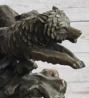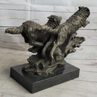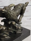 . Condition: This sculpture is in perfect condition Bronze Dimensions with Marble Base: Height 13" X Width 18" Marble Dimensions:12" X 7" Height without base:12" Weight:30 LBS Inventory:17YDW11213079 The power and mystique of the wolf come alive in this captivating bronze sculpture. Wolves, a symbol that evokes both fear and admiration, hold a unique place in the human psyche. They are known for their strong social bonds and unwavering commitment to their family, mirroring the complexities of human relationships. As the wolf's natural habitat continues to diminish, the parallels between their struggle and the challenges we face in our own shrinking world become apparent. This exquisite sculpture portrays the essence of the wolf's spirit and the delicate balance between human and animal existence. Crafted with utmost precision, it is made of 100% bronze using the revered "Lost Wax Method," ensuring every intricate detail is captured. The artist's skill is evident in the lifelike depiction of the wolf's posture, its intense gaze, and the texture of its fur. The sculpture stands as a reminder of the profound impact that humans have on the natural world and serves as a call to preserve and protect the delicate balance of our shared environment. Signed by M. Lopez, this bronze sculpture is a testament to the artist's dedication to capturing the essence of the wolf's character and the profound message it represents. It is not only a remarkable piece of art but also a thought-provoking symbol of our interconnectedness with the animal kingdom. Display it with pride in your home or art collection, sparking conversations about our responsibility to safeguard the precious resources and relationships that define our world.