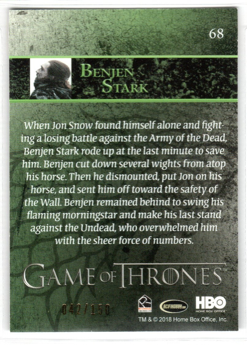 THIS IS A GOLD PARALLEL BASE CARD INSERTED IN THE GAME OF THRONES SEASON 7 SET RELEASED BY RITTENHOUSE ARCHIVES IN 2018. THESE CARDS WERE INSERTED AT A RATE OF ONLY 1 CARD PER BOX AND IT WOULD TAKE AT LEAST 7 CASES TO HAVE A CHANCE OF COMPLETING A SET OF 81 CARDS IF THE ODDS WERE PERFECT. EACH CARD IS FOIL STAMPED SERIAL NUMBERED TO /150. Please see my store for many other GREAT Non-Sports cards that I have for sale. FREE Domestic shipping includes Delivery Confirmation for items totaling over $100 USD with Buy It Now. JUST ADD ITEMS TO THE SHOPPING CART AND MAKE PAYMENT ALL AT ONCE TO GET THIS PROMOTION. (COMBINED SHIPPING BASED ON WEIGHT AND VALUE FOR ITEMS PURCHASED WITH ACCEPTED BEST OFFERS) PLEASE WAIT FOR A COMBINED SHIPPING INVOICE. Domestic (50 USA States) is shipped w/DELIVERY CONFIRMATION and International is shipped THROUGH THE EBAY GLOBAL SHIPPING PROGRAM ON ALL ITEMS NOW AS IT HAS JUST GOTTEN TO COMPLICATED TO DO OTHERWISE AND I CAN OFFER ITEMS IN MY STORE TO EVERYONE THAT WAY. ITEMS VALUED OVER $2500 ARE NOT AVAILABLE FOR INTERNATIONAL BUYERS.