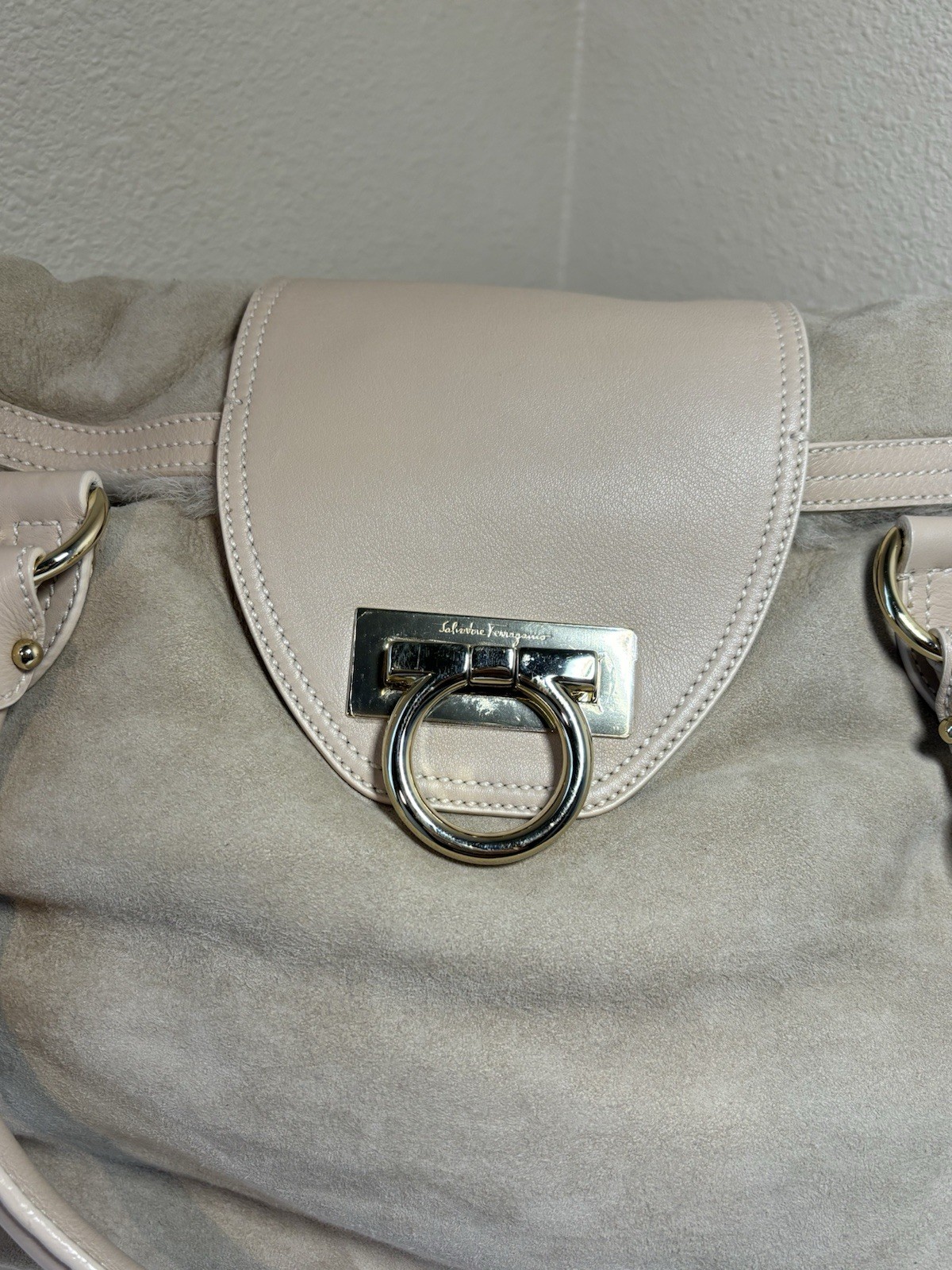 This gorgeous Ferragamo shoulder bag is a dream winter accessory! The soft shearling and suede combo feels so luxurious, while the pale pink leather trim adds a sweet pop of color. Love how roomy it is inside—perfect for carrying all my essentials in style. The gold Gancini closure and hardware give it that signature Ferragamo elegance. The protective base studs are a thoughtful touch for everyday use. An absolute stunner that keeps me cozy and chic all season long!