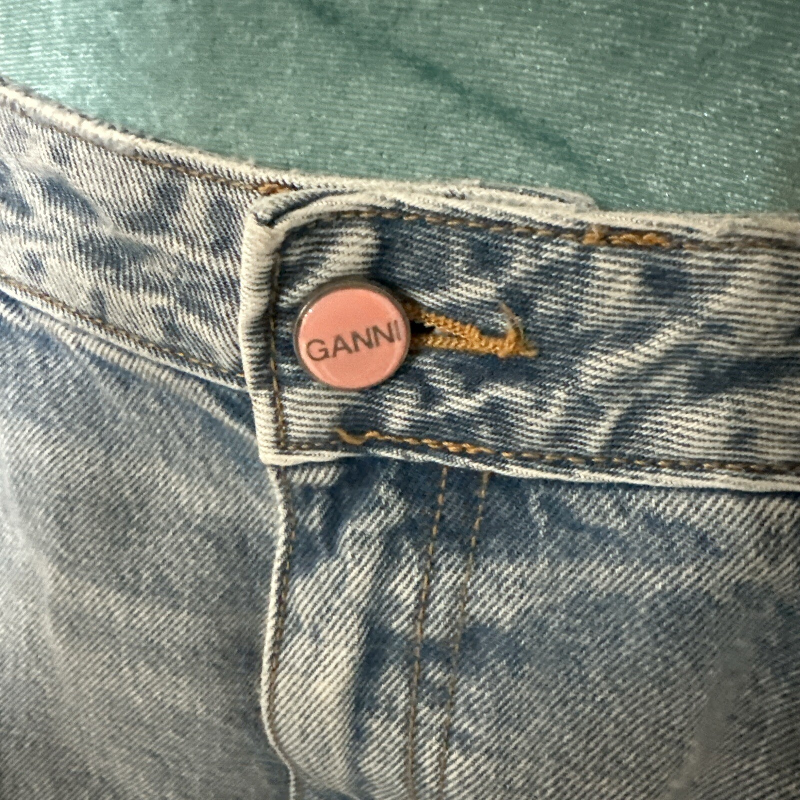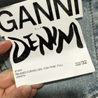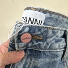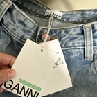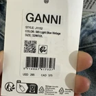 The Ganni Women Stary jeans feature a classic fit with a relaxed curved leg and a high-rise waist of 32 inches W and 32 L. Made from light wash denim material, these jeans have a solid light blue vintage color and a 5-pocket design. The jeans are designed for unisex adults in a regular size 32/32 with a 27-inch inseam. The Ganni Stary style embodies a bohemian, trendy, city, and 90s theme, offering a slimming and comfortable fit that is breathable and stylish. Designed for durability this denim is made from certified organic cotton that has a proven lower environmental impact than conventional cotton. It reduces water usages, greenhouse gas emissions and fewer chemicals are used. Ganni denim will only get better with wear. Retail: $295