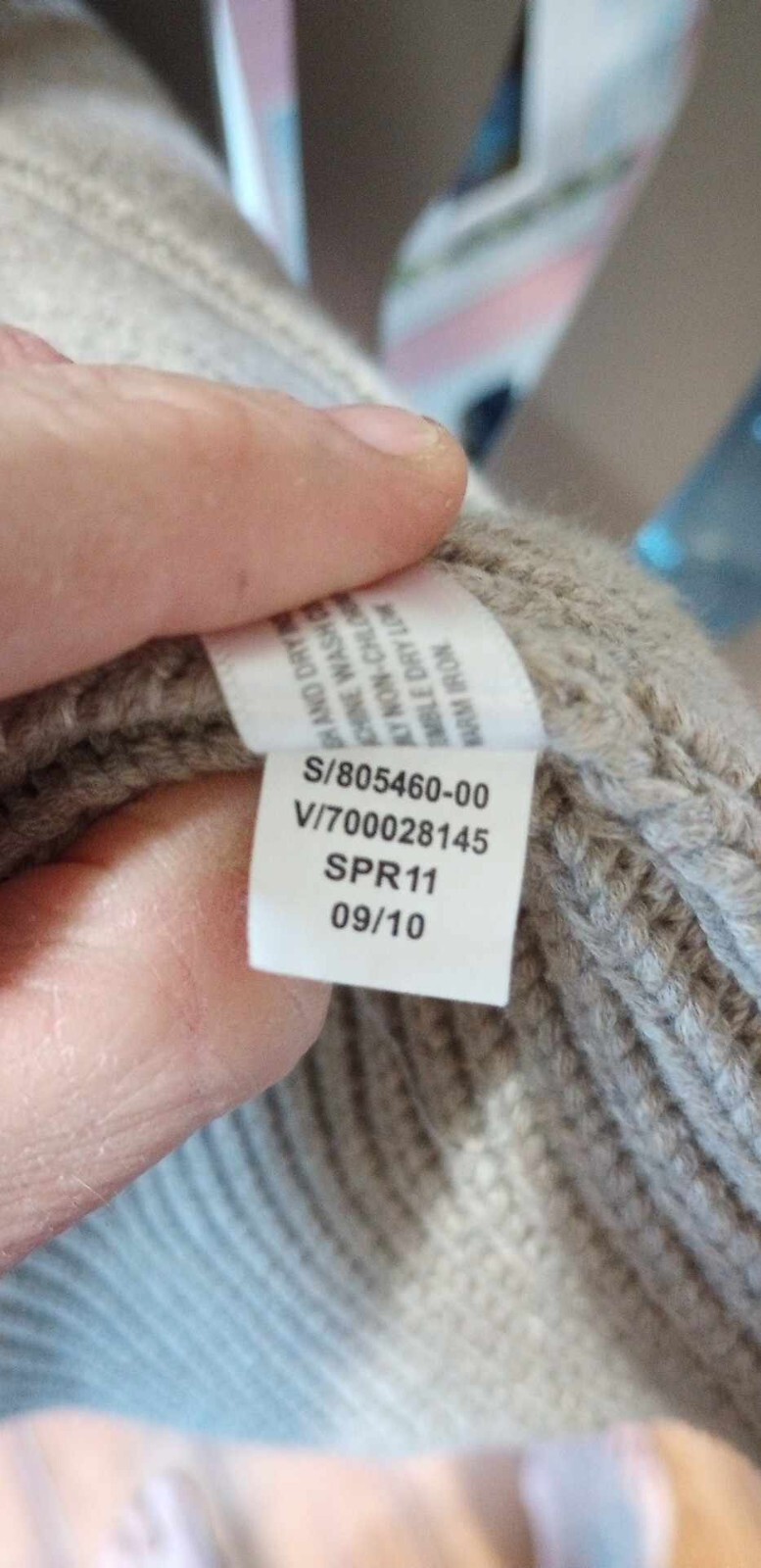 100% Cotton Heavy & Chunky Sleeves 28" Length 31" Color is a mix of tan/cream and gray Denim strip behind buttons