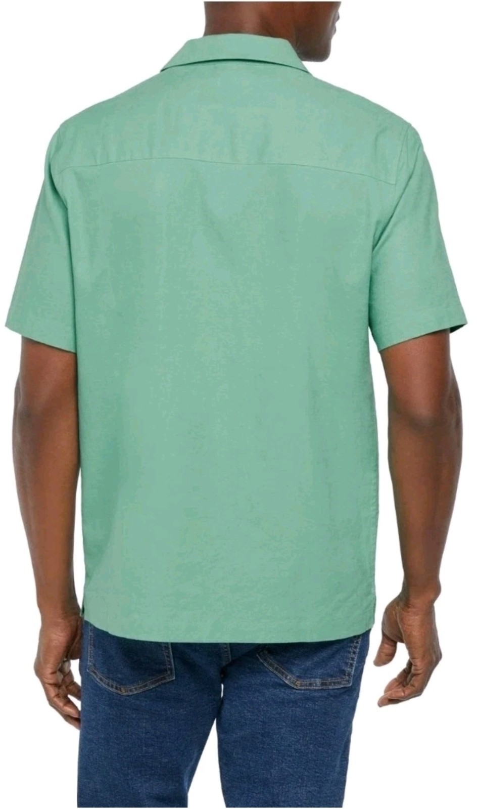 The product is a Gap Men's Green Short Sleeve Button-Up Linen Shirt in size Medium. It features a solid pattern, collared neckline, button closure, and a relaxed fit. Made of 53% linen, 45% rayon, and 2% spandex, this shirt is machine washable and has a chest pocket. The breathable fabric makes it suitable for casual occasions, and its origin is Cambodia. The green color adds a pop of freshness to any outfit, making it a versatile addition to any man's wardrobe.