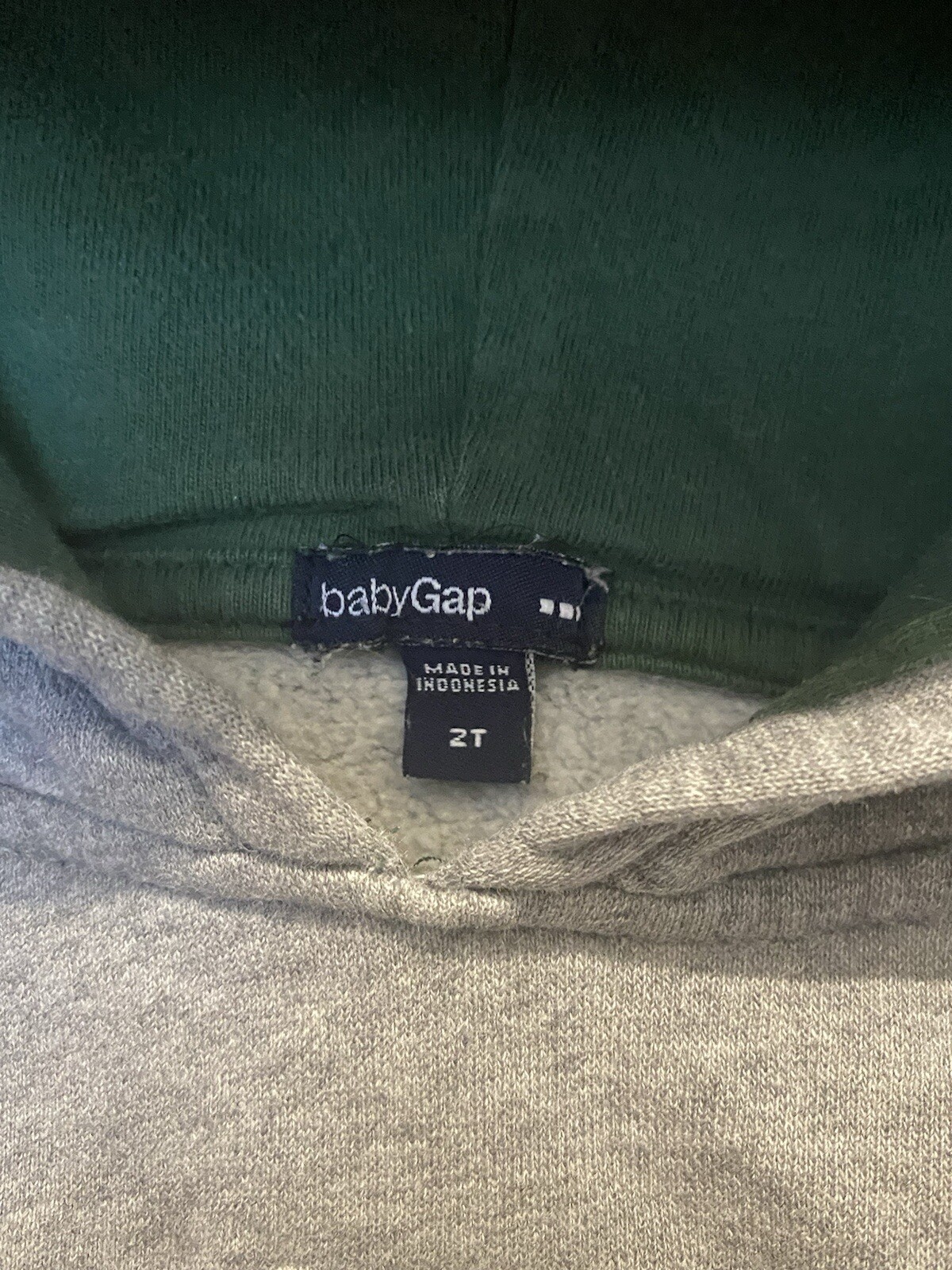 This is a Baby Gap pullover hoodie in size 2T for toddlers. The hoodie is in a classic gray color with a green GAP logo. It features a hood, pockets, long sleeves, and a crew neckline. Made from a blend of polyester and cotton, this sweater is suitable for travel, activewear, and casual wear during the fall, winter, and spring seasons. Perfect for little ones who love comfort and style.