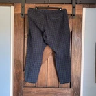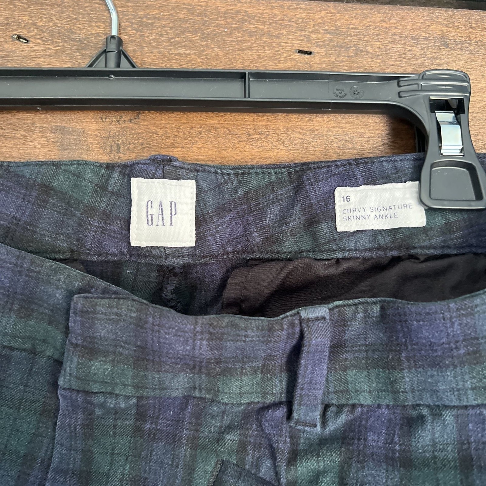 Gap Women's Signature Ankle Skinny Pants in a stylish multicolor plaid. These mid-rise pants offer a comfortable and flattering fit, perfect for both casual and semi-formal occasions. Features include a mid-rise waist, skinny ankle cut, and a classic plaid pattern in blue and green hues. The pants have some light wear, including some minor pulls in the fabric. There is also a small hole near a seam, as shown in the images. These pants are size 16 and provide a fashionable statement piece for your wardrobe.