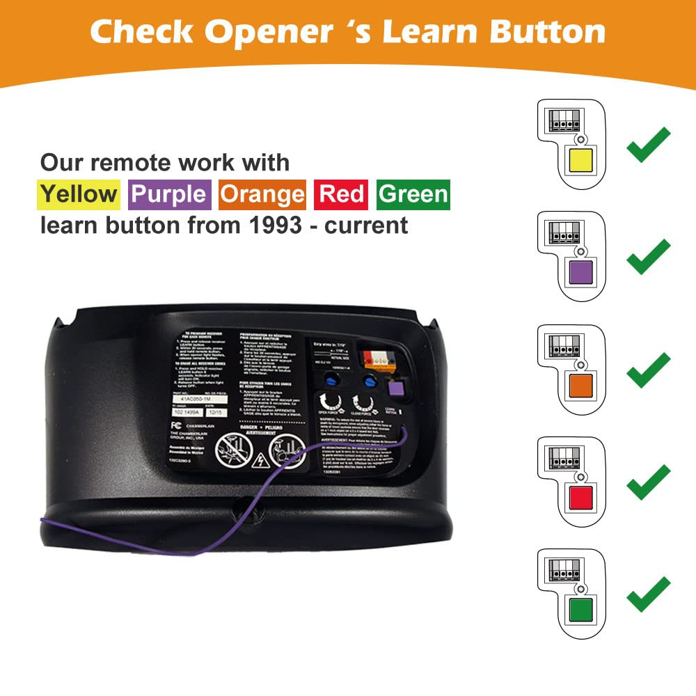 【Universal Compatibility】The universal garage door opener remote is compatible with LiftMaster Chamberlain Craftsman. True Value opener has Yellow/Purple/Orange/Red/Green. CAN’T work with dip switch. 【Safe & Reliable】The garage door opener remote replacement adopt the high level of encryption security+ 2.0 rolling code technology, works with frequency 310/315/390MHz, prevents others from invading your home. 【Multi-Channel Control 4 Doors】The keychain garage door remote has 4 buttons allow to control 4 garage door openers respectively, save your trouble of carrying multiple remotes. 【Easy to Program】The user instruction steps are simple and clearly. Program the universal garage door opener remote through the learn button of your door opener in a few minutes. 【1 To 1 Service】24h online service, any questions just feel free to contact with us by email first(). 1 year free-worry warranty.