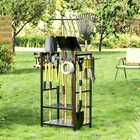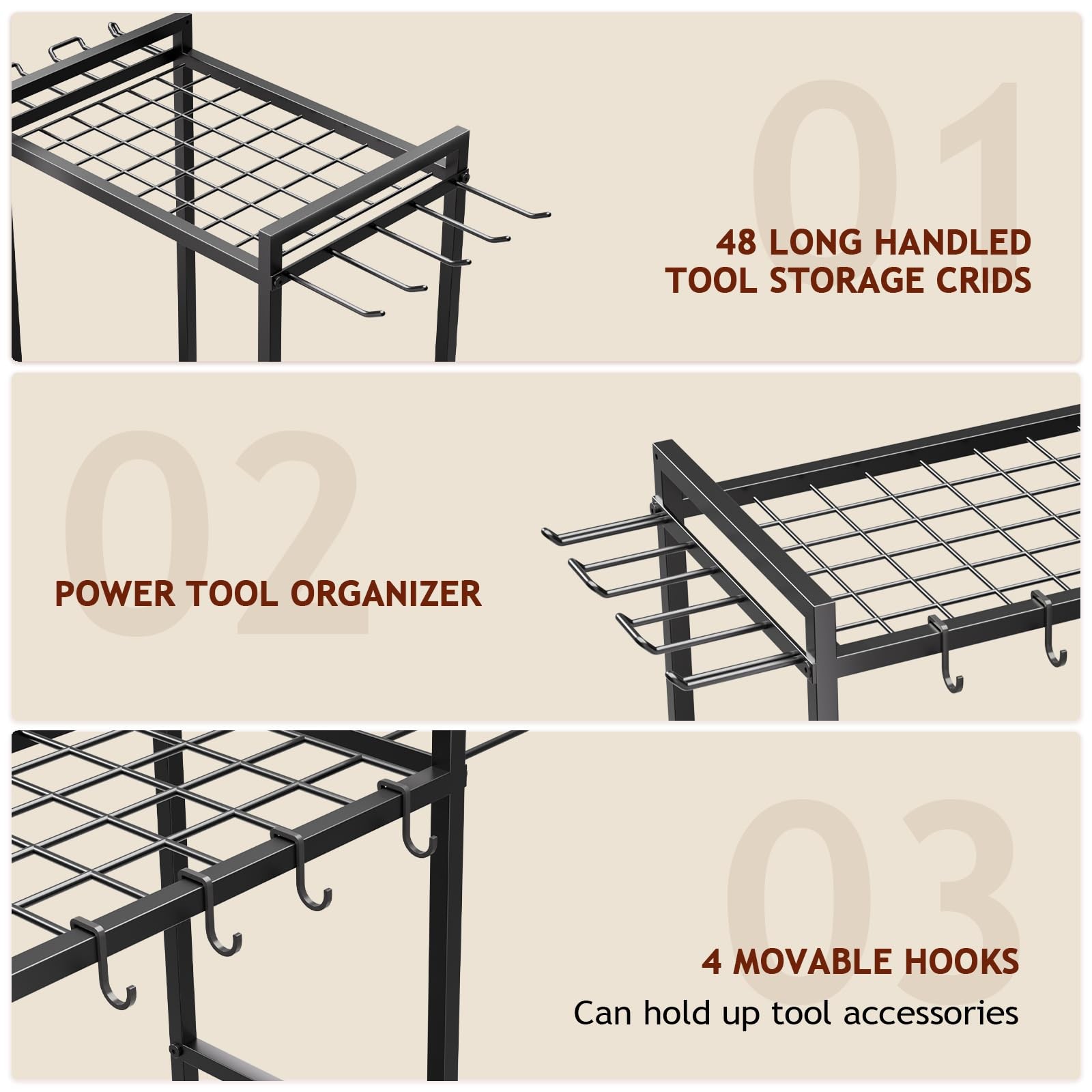 【Efficient Garden Tool Rack】: Elevate your gardening experience with the efficient garden tool organizer. Featuring 48 tool slots, it offers ample storage. The 4 movable garage hooks provide additional hanging options for easy access to frequently used tools. Equipped with adjustable feet, it adapts to any uneven surface. Simplify tool organization and arrangement with this practical garden tool storage holder, making your gardening tasks easier than ever before. 【Widely used and holds all tools】: This garden tool storage can be easily moved and placed wherever tools are needed, such as garages, gardens, sheds, and backyards. Custom-built to store gardening, yard, cleaning, and lawn tools, it easily accommodates items like shovels, pitchforks, rakes, dethatchers, pickaxes, mauls, brooms, and more, ensuring everything is in one place and readily accessible. It simplifies tool storage and organization, enhancing space utilization and work efficiency. 【Keep it tight, no more falling】: Paralleled up-down slots help keep sticks straight, ensuring most of your garden equipment remains in one spot without falling over. The bottom flow-through grate prevents standing water. 【Easy to move and assemble】: All necessary hardware is included, and the instruction manual offers clear, step-by-step guidance, enabling you to assemble it within minutes. storage rack can be easily moved and placed wherever tools are needed, making it a must-have tool organizer. 【Dimension & Warranty】: The dimension of this garden tool rack is 25"(L) x 11.8"(W) x 30.7"(H). If there is any question with our product or service, please feel free to contact us. We are always here to provide professional solution for you.