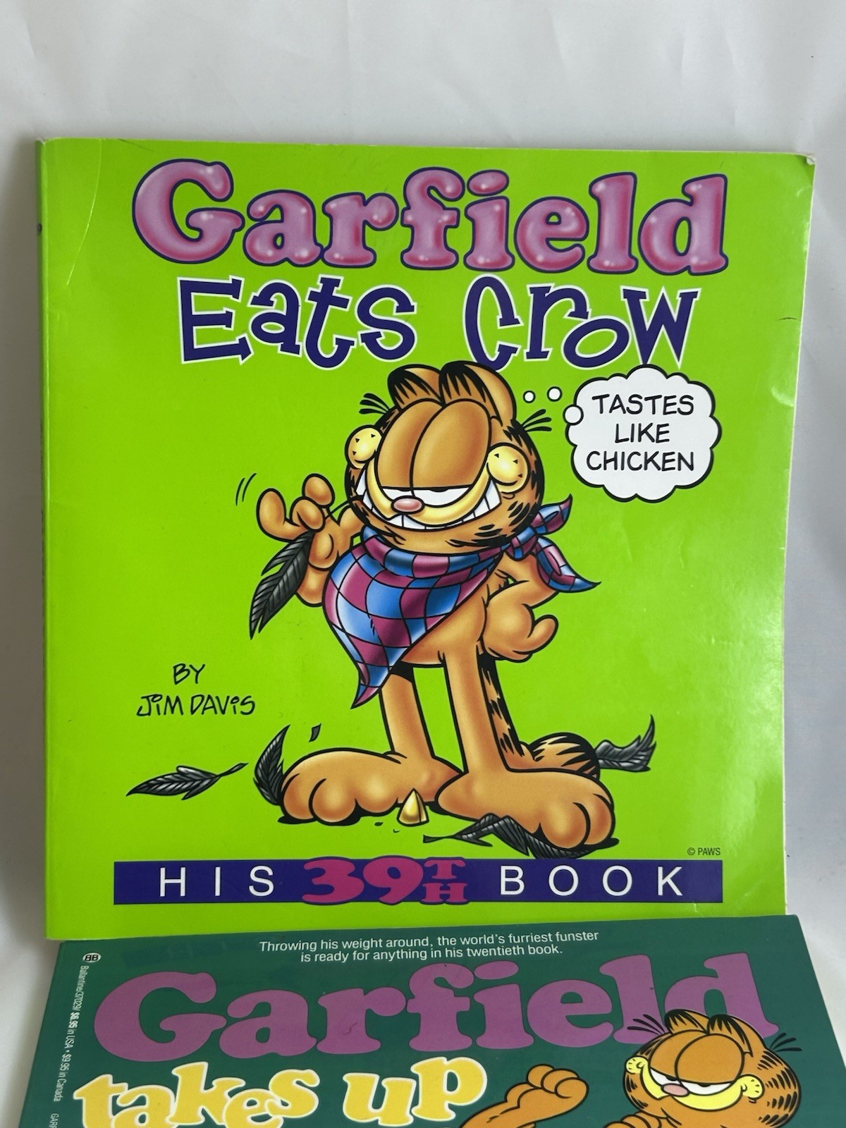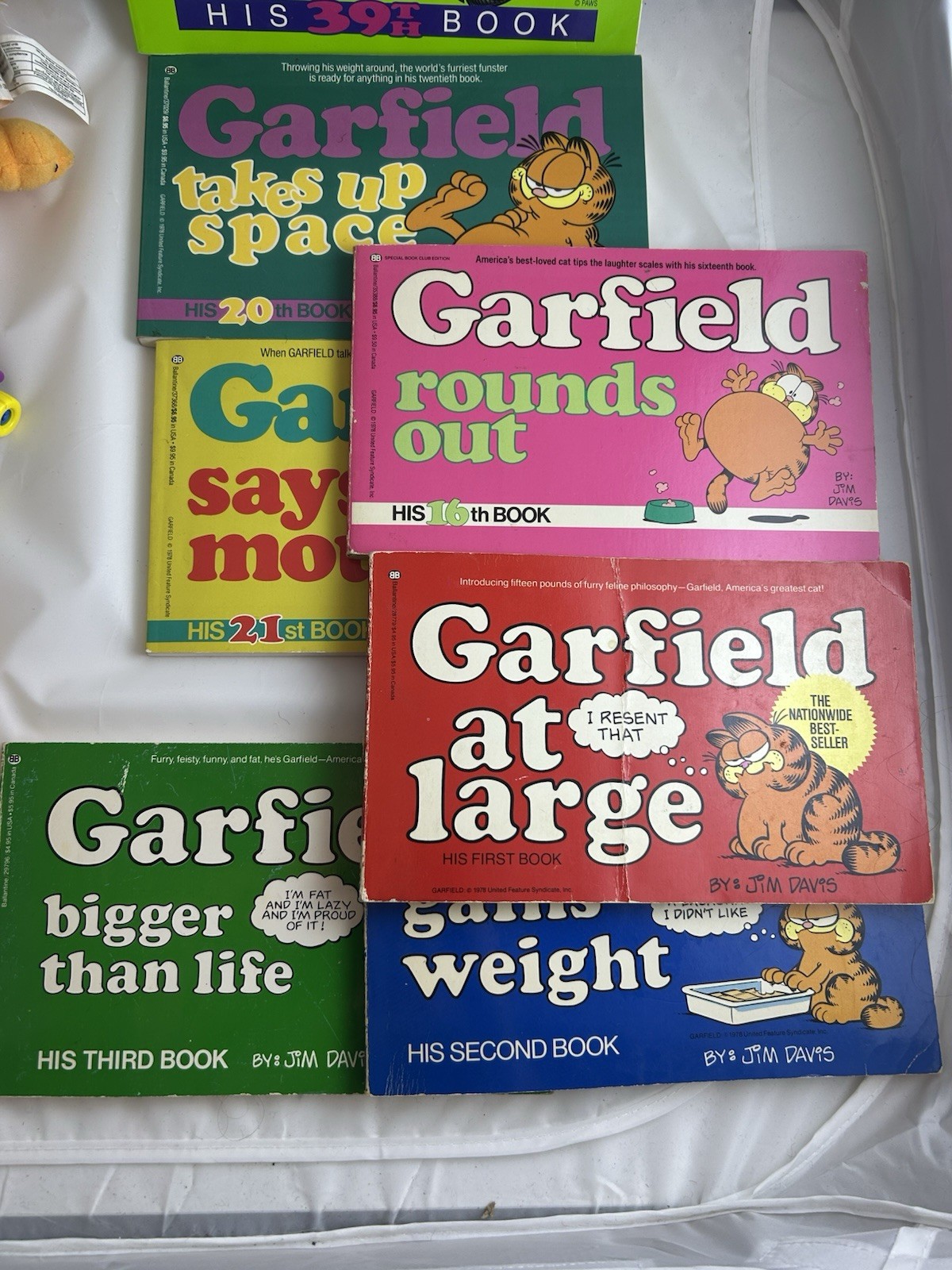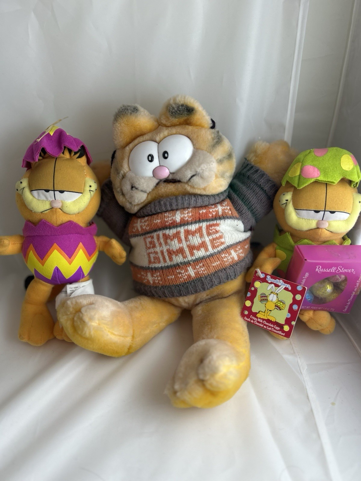 This Garfield Vintage lot includes three plushies (including two Russel Stover easter egg garfield plushies, and one Christmas Garfield with the “Gimme Gimme” sweater) , set of 3 mcdonald’s garfield mugs, Danbury Mint piece “catnap” 1993, PVC figures, a modern Garfield small zip up bag, and 7 books.