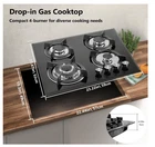 【High Efficiency 4 Burner Gas Stove with Plug】The Nardea 4 burner gas cooker has four different power burners, top left:6000 Btu, bottom left:12000 Btu, top right:6000 Btu, bottom right:3400, bottom left is the fast and efficient double ring burner. All four burner can be used simultaneously to save cooking time. 【NG/LPG Convertible with Thermocouple Protection】 The 4-burner gas stove is set by default for LPG and includes an additional nozzle for natural kits gas. It features thermocouple flame-out failure system (FFD) that automatically cuts off the gas supply if the flame goes out due to soup overflow, ensuring your family's safety at all times. 【Effortless Ignition Knob Control】 The Nardea glass gas stove features 4 knobs with an electronic pulse ignition system. Simply press and turn the knob counterclockwise to activate the heating area. This design eliminates the need for direct contact with a fire source, enhancing both safety and convenience in your kitchen. 【High Quality Glass Gas Stovetop 】The glass gas hob features a black toughened glass surface that is heat and corrosion resistant. Unlike stainless steel gas stove, this tempered glass surface is more durable and resistant to oxidation. Its smooth design prevents food from falling and drying out at high temperatures, making cleaning easier and keeping the surface smooth and spotless. 【Built-in & Countertop Gas Stove Top】 Choose between built-in or countertop installation for your 24 inch, 4-burner gas stove to match your kitchen style. The countertop design offers flexibility, making it convenient for outdoor kitchens, backyards, and easy relocation. The built-in option provides a sleek, high-end look, saving countertop space and enhancing your kitchen's appearance.