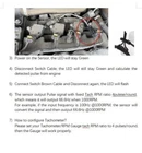 Model: GR01 1.Cable Definition RED: Power Supply 12V DC BLACK: Power GND BLACK/BROWN (1.6m): Input Signal Cable BLUE: Output Signal (fixed 4pulses/round rpm ratio) BROWN: Switch Control Cable 2.Configure Steps: 1)Connect Switch Cable to enter in setting mode 2)Find the Ignition Coil of your Gasoline Engine, normally it’s close to Spark Plug, which can be easily found from your engine/car/vehicle user guide. Wrap the input signal cable 5~8 round across the ignition coil cable, and then tighten like below: 3)Power on the Sensor, the LED will stay Green 4)Disconnect Switch Cable, the LED will still stay Green and calculate the detected pulse from engine 5)Connect Switch Brown Cable and Disconnect again, the LED will flash 6)The sensor output Pulse signal with fixed Tach RPM ratio 4pulese/round, which means it will output 66.6Hz when 1000RPM. For example, if the input frequency is 100Hz @1000RPM, the sensor will convert the signal and then output 66.6Hz @1000RPM 7)How to configure Tachometer? Please set your Tachometer/RPM Gauge tach RPM ratio to 4 pulses/round, then the Gauge will work properly. On Apr 7, 2025 at 06:50:56 PDT, seller added the following information: