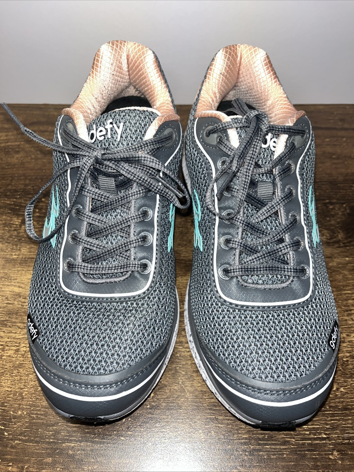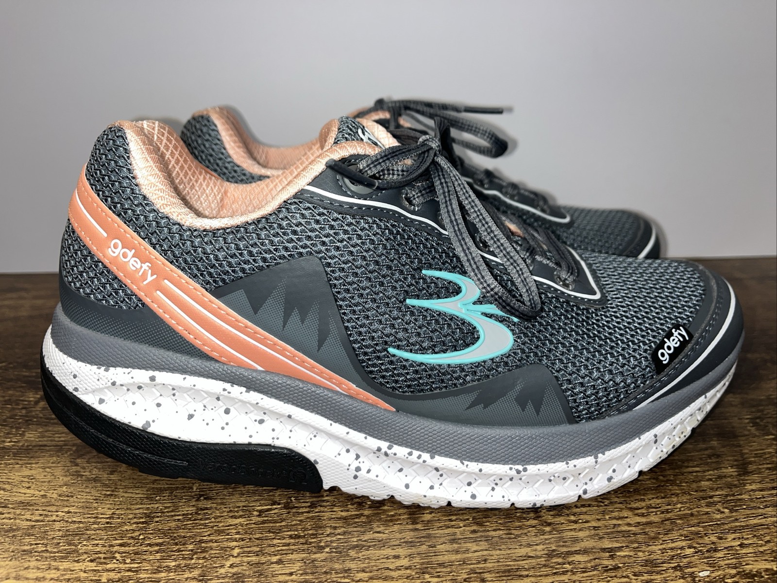 The Gdefy Gravity Defyer Mighty Walk Athletic Women's Pain Relief Shoes in size 9 offer comfort and relief for those suffering from foot pain. With a low top shoe shaft style, lace-up closure, and standard shoe width, these shoes are perfect for walking and other activities. The gray color and logo accents add a stylish touch, while the cushioned features provide added comfort. Made with fabric upper material, these shoes are suitable for various occasions and can be worn in any season.