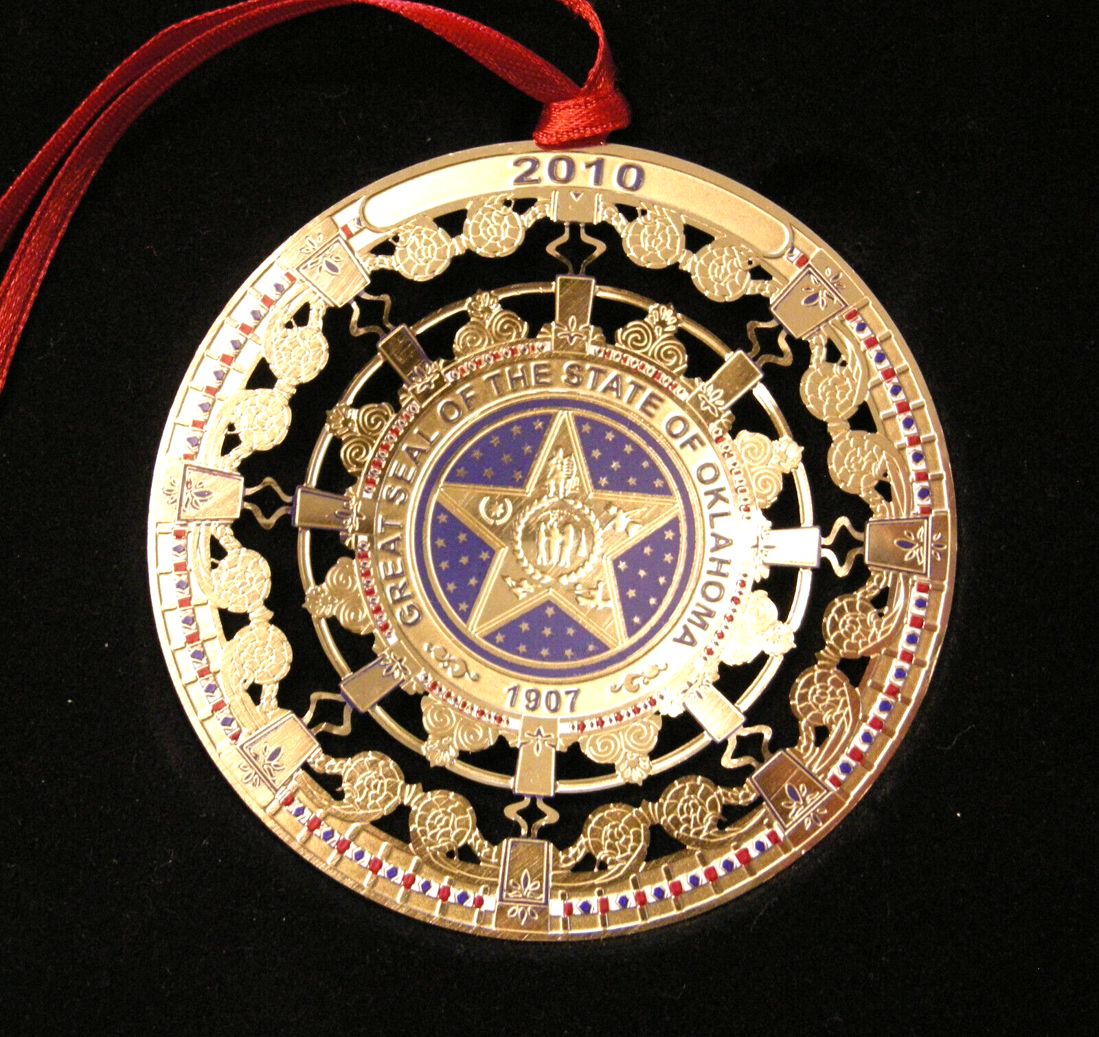 For consideration from the Historical Society of Oklahoma is the 2010 Oklahoma Ornament with box and paperwork. It is in like new condition. The seal of the State of Oklahoma features a five-pointed star. The figures and wreath in the center of the star derive from the Great seal of the Territory of Oklahoma. Above their heads is Oklahoma's State Motto: Labor conquers All Things. Please look closely at photos. V isit our eBay Store for a variety of classic, rare and hard-to-find books. OleTooks Ships Fast and Secure!