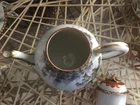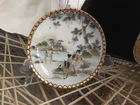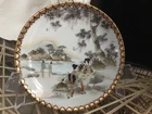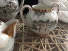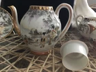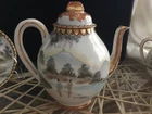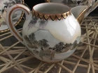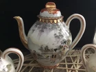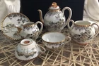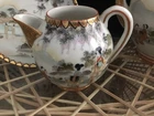 A pretty Vintage partial tea set, Kutani porcelain. This porcelain is so fine you can see your fingers through it. Teapot is approx. 6.75” tall Sugar & Creamer are approx. 3.50” tall Geisha Girl with Mount Fuji and water in the background. One teacup has a tiny ding on lip as shown at end of pen.