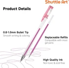 Gel Pen Refills, Shuttle Art 120 Colors (No 120 Count (Pack of 1), 120 Product Details Manufacturer: Shuttle Art Brand: Shuttle Art Item Weight: 7 ounces Package Dimensions: 10.67 x 5.75 x 0.63 inches Item model number: SAGP-120R Color: 120 Colors Closure: Snap Material Type: gel Number of Items: 120 Size: 120 Count (Pack of 1) Point Type: Fine Ink Color: Pastel Manufacturer Part Number: SAGP-120R Brand: Shuttle Art Ink Color: Pastel Style: Ballpoint Point Type: Fine Number of Pieces: 120 120 UNIQUE COLORS: Shuttle Art Gel Pen Refills Set has 120 unique colors, including 7 color types: glitter, neon glitter, metallic, neon, pastel, swirl, standard. Abundant colors with varied color types, fully meet your demands of coloring, writing and drawing. SMOOTH WRITING: Without skipping or bleeding, 0.8mm-1.0mm ballpoint tip can produce smooth and no skipping fine lines for coloring. And different color types are individually packaged, which makes it easier to find what you need. VARIETY OF USES: Great for bullet journaling, sketching, drawing, writing, coloring books and any other designs on Scrapbooks, School Projects, Party Invites, Greeting Cards, DIY Decor & Letters to Friends & Family. QUALITY GEL PEN REFILLS: The coloring gel pen refill set is non-toxic and acid-free. Conforms to ASTM-D4236. Definitely an ideal art supply for adults and kids. With those refills, there is no need to buy single pen. Less cost, more happiness.