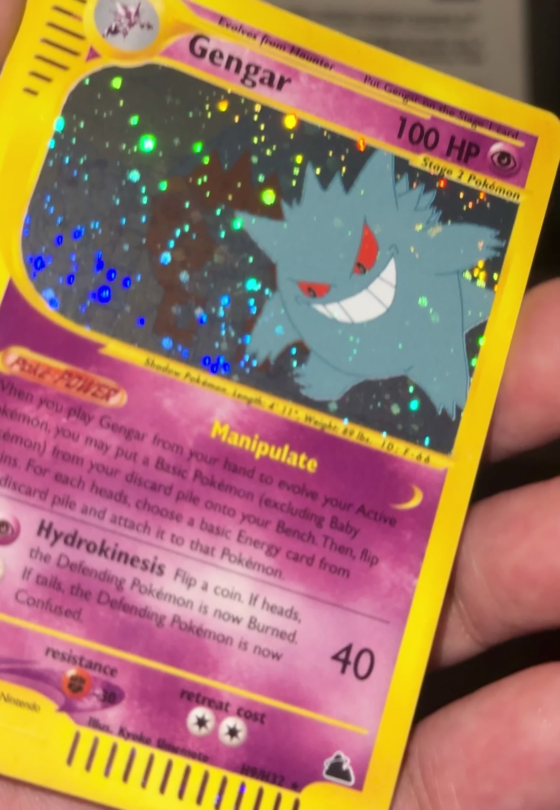 SWIRL + HOLO BLEED!!!! 10 contender!!!! Take it off my hands and grade this thing!!!!!! The Gengar H9/H32 Skyridge Holo card is a rare Pokémon TCG card from the Skyridge set. It features the attack Hydrokinesis with an HP of 100 and a retreat cost of CC. The card also has the ability to manipulate basic Pokémon through the use of Energy cards from the discard pile. With a stunning Holo finish and illustration by Kyoko Umemoto, this Gengar card is a valuable addition to any collector's deck.