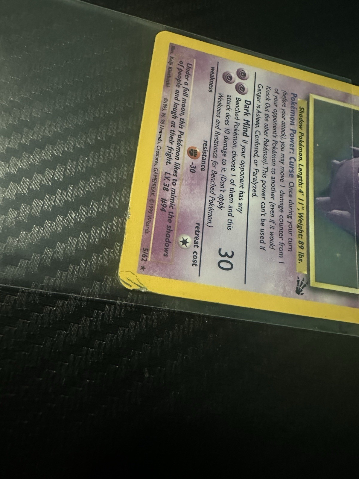 Ask is $45 OBO Gengar Fossil Unlimited 5/62 Heavily Played (There is lots of whitening on both, the front and the back. A little bit of silvering on the front and the corners/edges on the back are the worst part)