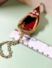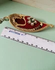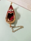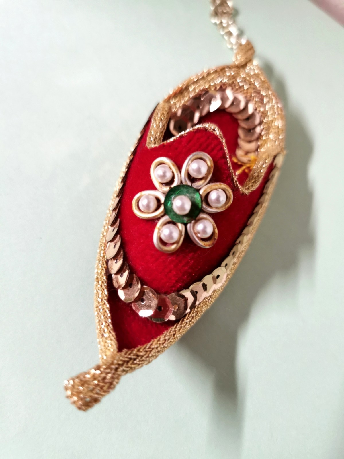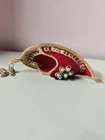 Vintage Handmade Red Velvet Embellished Genie Slipper Hanging Ornament. Unbranded Miniature 4" Genie Decor from Arabian & Muslam Mythology. Embellished in gold sequins and edging with round faux pearl beads as the center of flower petals decorating the top of the slipper. The gold coloring on the oval shaped petals outlining the beads has some fading and there is a tiny discolored spot on the velvet along the trim on the left side. There is a 2" gold tone metal chain attached for hanging. Please see the photos for further details of condition, design and measurements. Thank you!