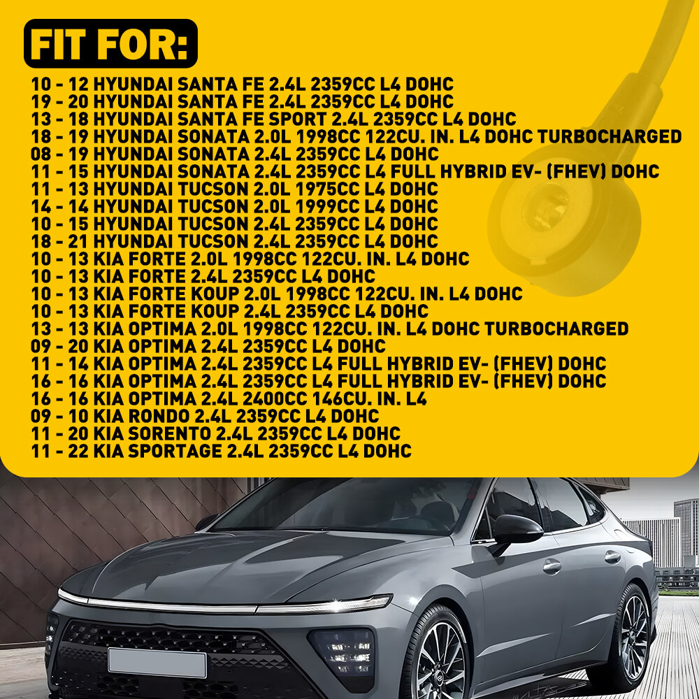 Fit for: 10 - 12 HYUNDAI SANTA FE 2.4L 2359CC L4 DOHC 19 - 20 HYUNDAI SANTA FE 2.4L 2359CC L4 DOHC 13 - 18 HYUNDAI SANTA FE SPORT 2.4L 2359CC L4 DOHC 18 - 19 HYUNDAI SONATA 2.0L 1998CC 122CU. IN. L4 DOHC TURBOCHARGED 08 - 19 HYUNDAI SONATA 2.4L 2359CC L4 DOHC 11 - 15 HYUNDAI SONATA 2.4L 2359CC L4 FULL HYBRID EV- (FHEV) DOHC 11 - 13 HYUNDAI TUCSON 2.0L 1975CC L4 DOHC 14 - 14 HYUNDAI TUCSON 2.0L 1999CC L4 DOHC 10 - 15 HYUNDAI TUCSON 2.4L 2359CC L4 DOHC 18 - 21 HYUNDAI TUCSON 2.4L 2359CC L4 DOHC 10 - 13 KIA FORTE 2.0L 1998CC 122CU. IN. L4 DOHC 10 - 13 KIA FORTE 2.4L 2359CC L4 DOHC 10 - 13 KIA FORTE KOUP 2.0L 1998CC 122CU. IN. L4 DOHC 39250-2G100 Genuine Knock Sensor Fits For 10 - 12 Hyundai Kia M Fit for: 10 - 12 HYUNDAI SANTA FE 2.4L 2359CC L4 DOHC 19 - 20 HYUNDAI SANTA FE 2.4L 2359CC L4 DOHC 13 - 18 HYUNDAI SANTA FE SPORT 2.4L 2359CC L4 DOHC 18 - 19 HYUNDAI SONATA 2.0L 1998CC 122CU. IN. L4 DOHC TURBOCHARGED 08 - 19 HYUNDAI SONATA 2.4L 2359CC L4 DOHC 11 - 15 HYUNDAI SONATA 2.4L 2359CC L4 FULL HYBRID EV- (FHEV) DOHC 11 - 13 HYUNDAI TUCSON 2.0L 1975CC L4 DOHC 14 - 14 HYUNDAI TUCSON 2.0L 1999CC L4 DOHC 10 - 15 HYUNDAI TUCSON 2.4L 2359CC L4 DOHC 18 - 21 HYUNDAI TUCSON 2.4L 2359CC L4 DOHC 10 - 13 KIA FORTE 2.0L 1998CC 122CU. IN. L4 DOHC 10 - 13 KIA FORTE 2.4L 2359CC L4 DOHC 10 - 13 KIA FORTE KOUP 2.0L 1998CC 122CU. IN. L4 DOHC 10 - 13 KIA FORTE KOUP 2.4L 2359CC L4 DOHC 13 - 13 KIA OPTIMA 2.0L 1998CC 122CU. IN. L4 DOHC TURBOCHARGED 09 - 20 KIA OPTIMA 2.4L 2359CC L4 DOHC 11 - 14 KIA OPTIMA 2.4L 2359CC L4 FULL HYBRID EV- (FHEV) DOHC 16 - 16 KIA OPTIMA 2.4L 2359CC L4 FULL HYBRID EV- (FHEV) DOHC 16 - 16 KIA OPTIMA 2.4L 2400CC 146CU. IN. L4 09 - 10 KIA RONDO 2.4L 2359CC L4 DOHC 11 - 20 KIA SORENTO 2.4L 2359CC L4 DOHC 11 - 22 KIA SPORTAGE 2.4L 2359CC L4 DOHC Specifications: OE Number: 392502G000, 392502G100 Features: *Function The engine needs to ignite for the best performance and power. If the ignition time is too late or early, it may lead to engine vibration. The knock sensor detects this vibration and converts the results into an electronic signal transmitted to the ECU for correction of the ignition timing. *Accurate Parameters Manufactured according to the original factory specifications and perfect match for your car. *Direct Replacement Easy installation without other modifications. *Stable Performance Good quality ensures stable performance and high reliability. *Warm Notice Please double-check the part number and models in the description to guarantee it fits your vehicle before ordering. Packaging Include: Knock sensor*1 ABOUT US 39250-2G100 Genuine Knock Sensor Fits For 10 - 12 Hyundai Kia M Fit for: 10 - 12 HYUNDAI SANTA FE 2.4L 2359CC L4 DOHC 19 - 20 HYUNDAI SANTA FE 2.4L 2359CC L4 DOHC 13 - 18 HYUNDAI SANTA FE SPORT 2.4L 2359CC L4 DOHC 18 - 19 HYUNDAI SONATA 2.0L 1998CC 122CU. IN. L4 DOHC TURBOCHARGED 08 - 19 HYUNDAI SONATA 2.4L 2359CC L4 DOHC 11 - 15 HYUNDAI SONATA 2.4L 2359CC L4 FULL HYBRID EV- (FHEV) DOHC 11 - 13 HYUNDAI TUCSON 2.0L 1975CC L4 DOHC 14 - 14 HYUNDAI TUCSON 2.0L 1999CC L4 DOHC 10 - 15 HYUNDAI TUCSON 2.4L 2359CC L4 DOHC 18 - 21 HYUNDAI TUCSON 2.4L 2359CC L4 DOHC 10 - 13 KIA FORTE 2.0L 1998CC 122CU. IN. L4 DOHC 10 - 13 KIA FORTE 2.4L 2359CC L4 DOHC 10 - 13 KIA FORTE KOUP 2.0L 1998CC 122CU. IN. L4 DOHC 10 - 13 KIA FORTE KOUP 2.4L 2359CC L4 DOHC 13 - 13 KIA OPTIMA 2.0L 1998CC 122CU. IN. L4 DOHC TURBOCHARGED 09 - 20 KIA OPTIMA 2.4L 2359CC L4 DOHC 11 - 14 KIA OPTIMA 2.4L 2359CC L4 FULL HYBRID EV- (FHEV) DOHC 16 - 16 KIA OPTIMA 2.4L 2359CC L4 FULL HYBRID EV- (FHEV) DOHC 16 - 16 KIA OPTIMA 2.4L 2400CC 146CU. IN. L4 09 - 10 KIA RONDO 2.4L 2359CC L4 DOHC 11 - 20 KIA SORENTO 2.4L 2359CC L4 DOHC 11 - 22 KIA SPORTAGE 2.4L 2359CC L4 DOHC Specifications: OE Number: 392502G000, 392502G100 Features: *Function The engine needs to ignite for the best performance and power. If the ignition time is too late or early, it may lead to engine vibration. The knock sensor detects this vibration and converts the results into an electronic signal transmitted to the ECU for correction of the ignition timing. *Accurate Parameters Manufactured according to the original factory specifications and perfect match for your car. *Direct Replacement Easy installation without other modifications. *Stable Performance Good quality ensures stable performance and high reliability. *Warm Notice Please double-check the part number and models in the description to guarantee it fits your vehicle before ordering. Packaging Include: Knock sensor*1 FAQ Shipping Returns Contact Us Payment Why swith to LED? LEDs not only give your vehicle a clean, modern look but, with proper use, will outlast any halogen bulb and HID bulb! Low energy draw, high lumen output, and instant on/off LED technology out shines stock bulbs in every way. Which bulbs are used in my vehicle? Check Sylvania automotive lamp replacemnt guide , you can select the year, make, and model of your vehicle, then select the application you want to replace or upgrade from stock. What does CAN Bus mean? CAN Bus means Controller Area Network Bus. This system monitors your vehicle and reports operating conditions. CAN Bus systems are commonly found in European vehicles such as BMW, Audi, Mercedes, Volkswagen, Porsche, and in many American vehicles. While most late model American vehicles have CAN Bus systems, it is always good to check with your vehicle dealer to see which system your vehicle has before purchasing electrical products. When do you need Warning Canceller? Some vehicles with cmplex internal computers(such as Audi,BMW,Jaguar,Mercedes,etc.) might report on-dash errors or flickering on the headlights. The warning canceller fixes the dashboard warning and flickering effect. Bulb Out Dashboard Error: On some vehicles, the dashboard will report as if you have a headlight bulb missing or burnt. It does not affect the headlights functioning, but the light on-dash will be on. The warning canceller fixes the issue. Flickering Issue: This happens when your vehi