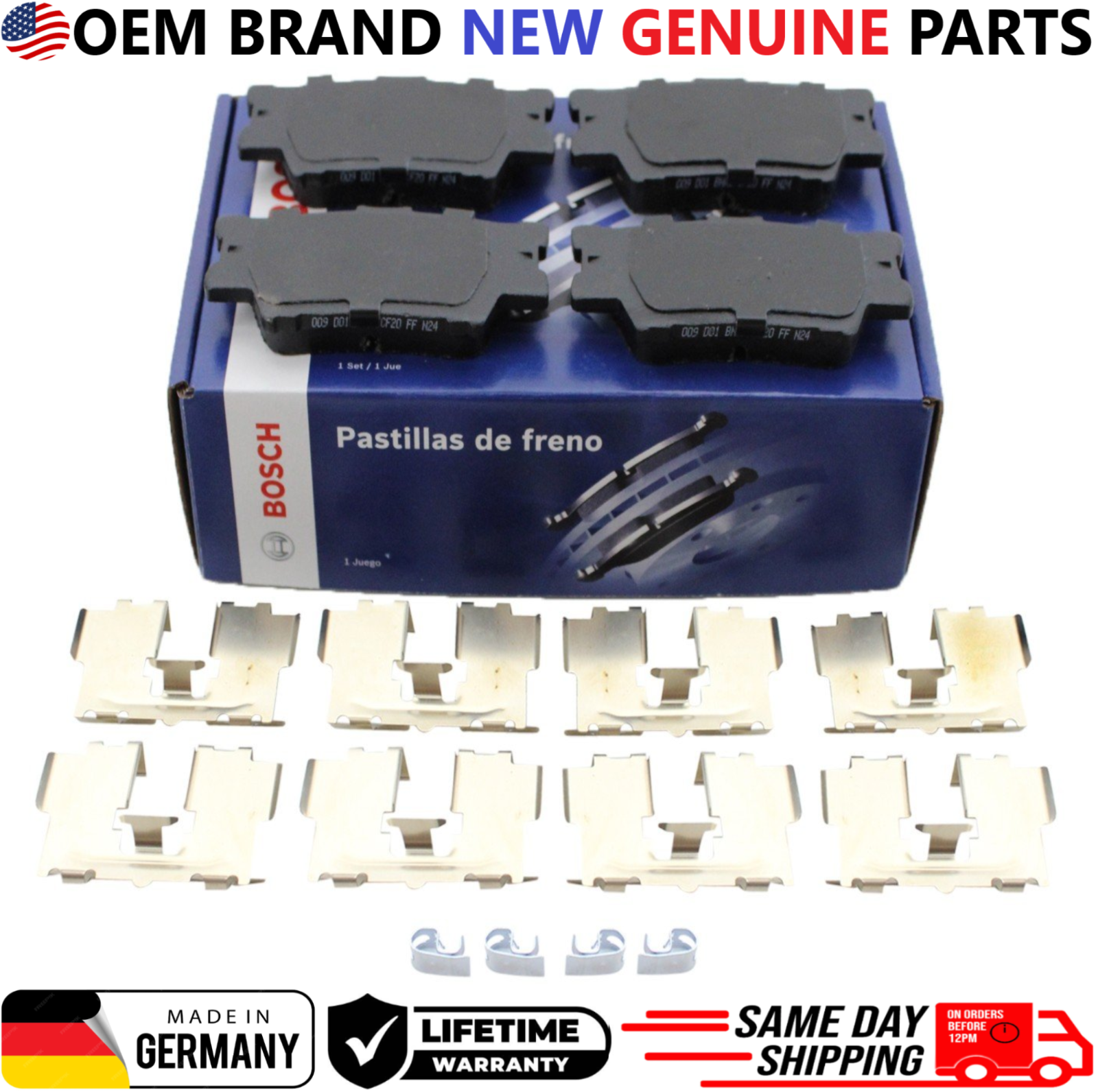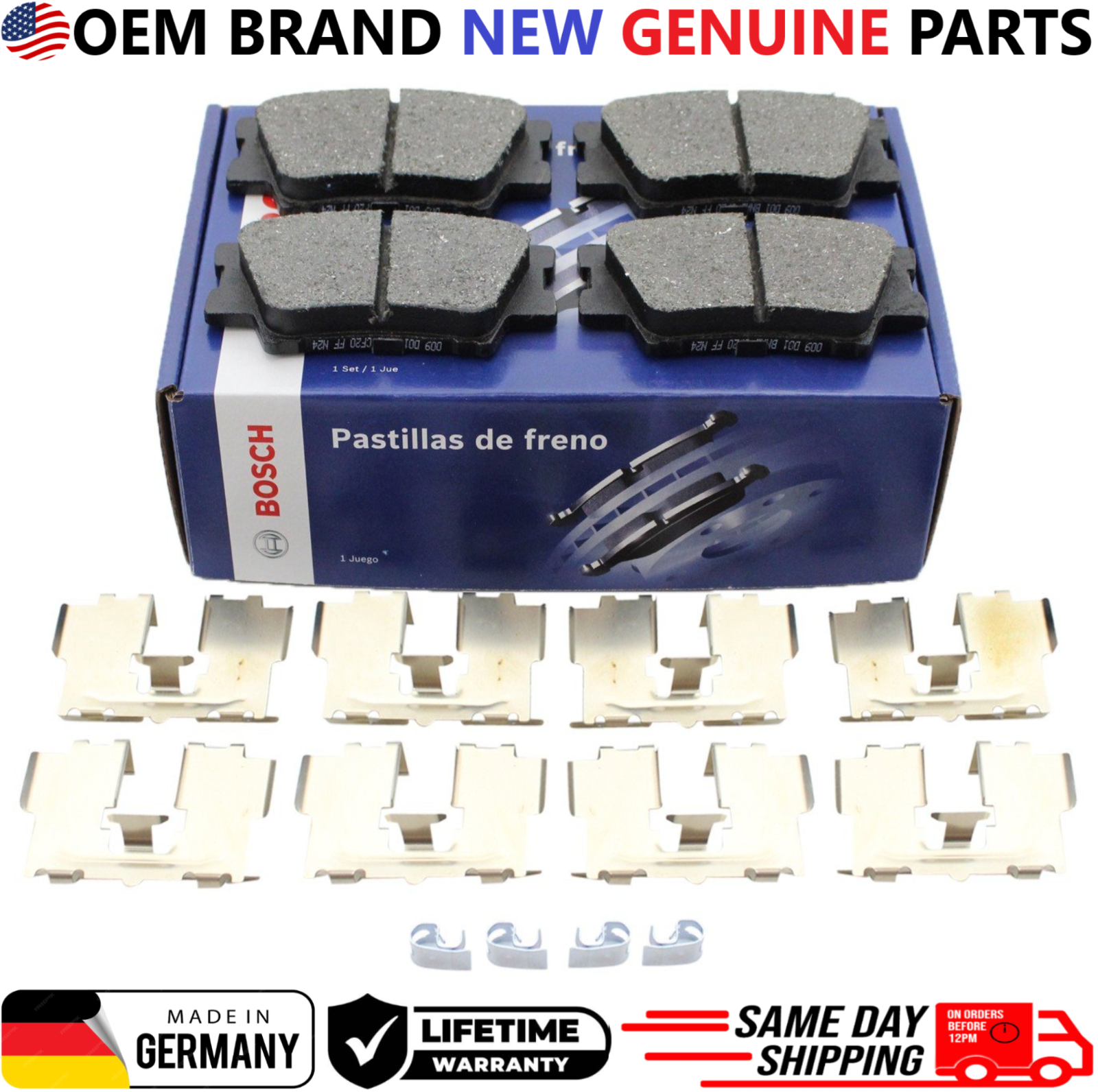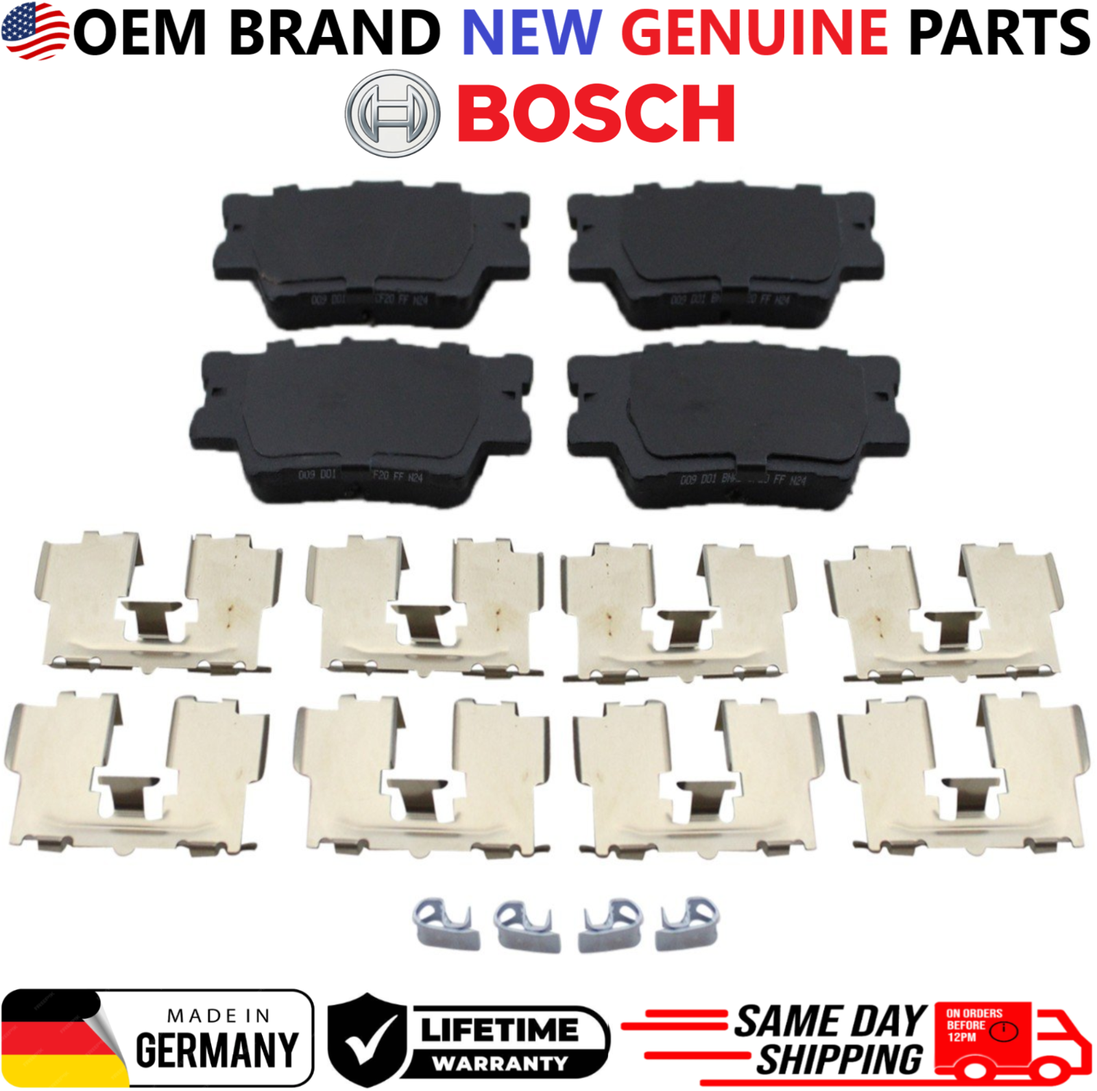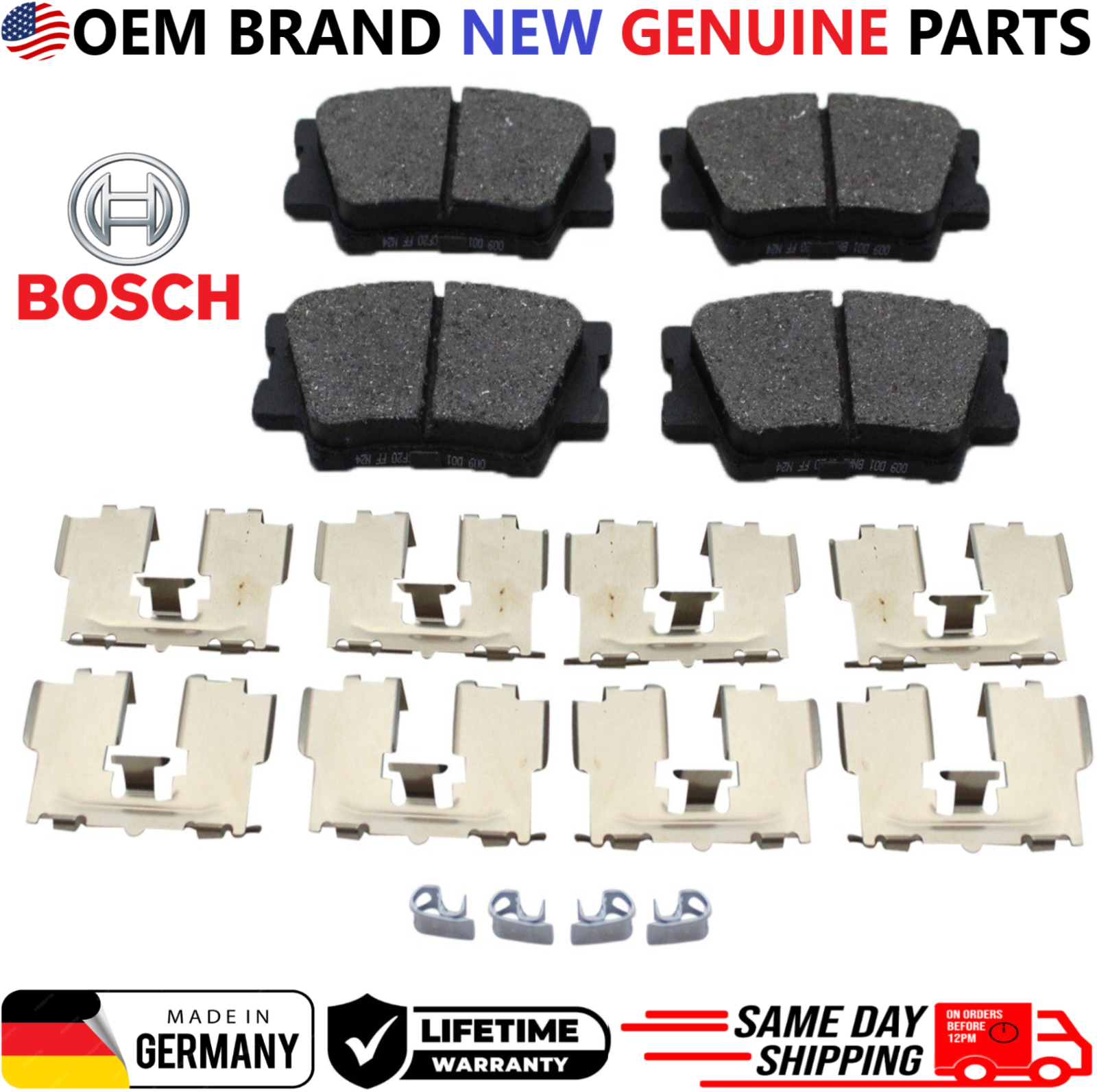 Replace your worn rear brake pads with Bosch BE1212H Rear Brake Pad Set , engineered for quiet braking, low dust, and consistent stopping performance. This listing is for a REAR brake pad set only and includes hardware for direct OEM-style installation. Product Details Brand: Bosch Part Number: BE1212H Position: Rear Brake Pad Type: Ceramic Includes Hardware: Yes Condition: New OEM Part Numbers 0446602220, 0446606090, 0446606210, 0446633160, 0446633210, 0446642070, 04466YZZE8, 0446606060, 0446606100, 0446606220, 0446633180, 0446642060, 0446675010, 19184917, 0446606070, 0446606200, 044660A010, 0446633200, 044664206079, 04466WY050 Interchange / Cross Reference Numbers ACT1212A, 17-1212, 171212, ZD1212, 16-1212, 161212, BC1212, ASP1212A, NXT-1212, NXT1212, BE1212, PC1212, P83089N, 355006881, 355034311, SBC1212, 105.12120, 10512120, 1310-1632-00, 1310163200, 1551-1632-00, 1551163200, 103.12120, 10312120, 301.12120, 30112120, BP1212MS, CFC1212, 1311-1632-00, 1311163200, MGD1212CH, QC1212, EHT1212H, OEX1212, AD1212, 22-0749-0, 2207490, 605765, 305.12120, 30512120, 308.12120, 30812120 Vehicle Compatibility (REAR Only) 2012, 2013, 2014, 2015, 2016, 2017 Toyota Camry 2.5L L4 REAR 2012, 2013, 2014, 2015, 2016, 2017 Toyota Camry 3.5L V6 REAR 2014, 2015, 2016, 2017, 2018, 2019 Toyota Corolla 1.8L L4 REAR 2016, 2017, 2018 Toyota Corolla 2.0L L4 REAR 2013, 2014, 2015, 2016, 2017 Toyota Avalon 3.5L V6 REAR 2013, 2014, 2015, 2016, 2017 Toyota RAV4 2.5L L4 REAR 2013, 2014, 2015, 2016, 2017 Lexus ES350 3.5L V6 REAR 2014, 2015, 2016, 2017 Lexus IS250 2.5L V6 REAR 2014, 2015, 2016, 2017 Lexus IS350 3.5L V6 REAR ⚠ Important Notice: This item fits REAR brake systems only . Buyer must verify VIN, engine size, and rear brake configuration before purchase. Shipping: Handling time - 1 business day International, Priority, and Express shipping is also available. Warranty: We provide a LIFETIME WARRANTY for all our products (For Warranty claim please contact us) Returns and refunds: We accept returns within 60 days after receiving the package. All returned items must be unused and in the original packaging.