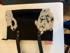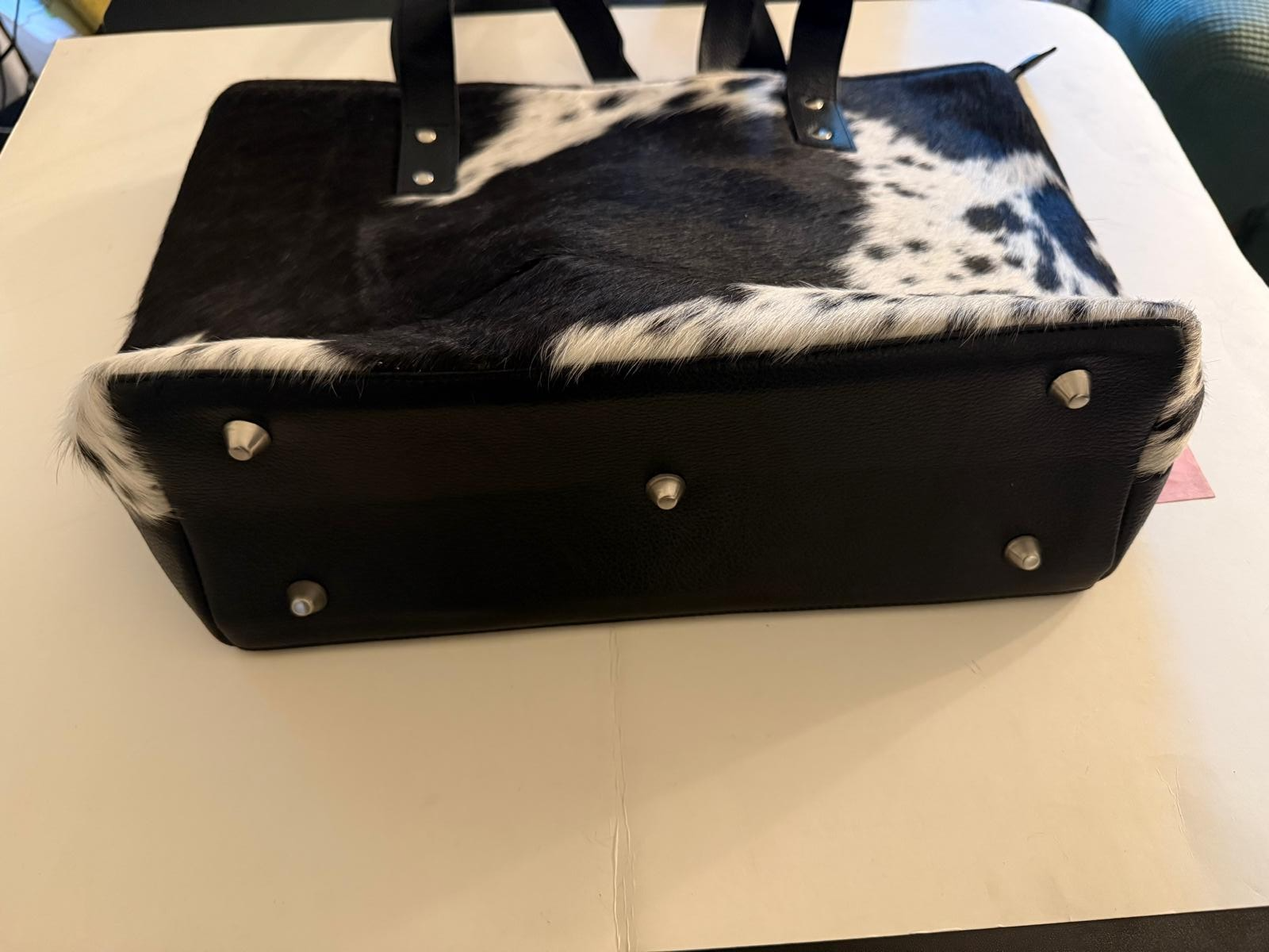 Item Description Add a bold, stylish touch to your everyday look with this beautiful black and white hair-on cowhide tote bag . Crafted from genuine cowhide, this bag features a unique natural pattern—no two are ever alike. The leather handles are sturdy and comfortable, making it perfect for daily use, travel, work, or as a standout fashion accessory. Features Material: Genuine hair-on cowhide with leather straps Color: Black & white natural hide pattern Straps: Durable black leather handles secured with metal rivets Style: Western, boho, rustic, rodeo, modern casual Closure: Zipper closure Interior: (Add details if you'd like—lining, pockets, etc.) Measurements Length: 17 inches Height: 11 inches Width: 5 inches Condition New with tags. This item has never been used and comes in excellent, gift-ready condition. Why You’ll Love It This tote combines durability with a striking natural hide pattern. It’s eye-catching, practical, and pairs beautifully with both casual and Western-inspired outfits. A great everyday tote or standout statement piece.