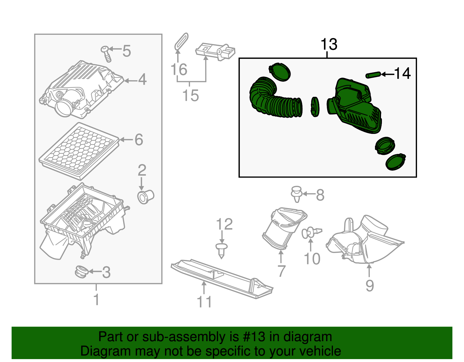 aaronchevrolet Genuine GM Air Cleaner Outlet Duct 22761486 Part can be found as # 13 in the diagram above Product Description 2.4L. Outlet duct. Helps guide airflow to your vehicle's air filter This GM Genuine Part is designed, engineered, and tested to rigorous standards and is backed by General Motors Specifications Brand GM Manufacturer Part Number 22761486 SKU 22761486 Product Genuine GM Air Cleaner Outlet Duct 22761486 Replaces 13309328, 13324274, 20918645, 20971700, 22951183 ONLY PART REFERENCE #13 ON THE DIAGRAM IS INCLUDED WARNING : May cause cancer and reproductive harm. See www.P65Warnings.ca.gov for more info. Thank you for looking! Terms and Conditions Thank you for shopping with us. Please find our policies below. If you have any other questions, please don't hesitate to contact us. Shipping Terms If you are located in Alaska, Hawaii or Puerto Rico Please contact us via eBay email to discuss shipping cost In stock orders ship within 24 hours. Weekend orders will be processed the next business day. If a part is not in stock and must be ordered from the manufacturer, it usually takes 2-3 days to arrive to us and will be promptly shipped to you. Most of the orders are shipped complete within 2-3 business days. A few of the parts ordered from the manufacturer may take up to 5-6 business days to arrive and will shipped to you immediately. Depending upon location, ground shipments usually take 2-7 days. Your order may be shipped Overnight for an additional cost. Oversized shipments will be additional; you will be contacted prior to shipping for approval. We cannot guarantee transit times for ground and oversize orders. Shipping Carrier substitutions may be made at our determination in an attempt to reduce shipping cost to the customer. We do not ship internationally. In the unlikely event that a part has been placed on backorder or discontinued, we will do our best to try and find one for you as quickly as possible. We do not ship COD orders. Return Policy Contact us to arrange for any returns. A copy of the invoice will need to be included with the return. There is a 35% restocking fee charged against all parts eligible for return. Please contact us to find out if your part is eligible for return. Parts are not eligible for return if a VIN # was not provided. Parts must be resaleable and in the original packaging. We cannot take back used parts. We cannot take back installed or tried parts. Electrical parts are not returnable. We do reserve the right to refuse and return (at the buyer's expense) any parts we find have been installed, are used, or do not meet the above criteria. Return requests need to be within 30 days of receipt. Special-ordered and Discontinued items are not eligible for returns. All returns are subject to inspection There is a 35% restocking fee charged against all parts eligible for return. Please contact us to find out if your part is eligible for return. Cancellation Policy An order or a portion of an order may be cancelled up until the time it is shipped and no longer in our possession. Home • Newsletter Signup • Contact Us Copyright © 2025 aaronchevrolet , All rights reserved. Solution by RevolutionParts, Inc. :: Design by OCDesignsOnline
