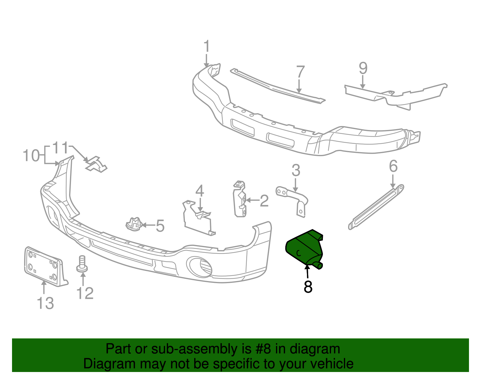 World Parts Direct Genuine GM Front Driver Side Bumper Impact Bar Bracket with Bolt 12335637 Part can be found as # 8 in the diagram above Product Description 2003-07 gmc without c3 & denali. 1/2 ton. 4wd, 1500 series. 2WD. 1500 with cladding. 2wd, 1500 series. Chevrolet. Helps align and secure your vehicle's bumper impact bar This GM Genuine Part is designed, engineered, and tested to rigorous standards and is backed by General Motors Specifications Brand GM Manufacturer Part Number 12335637 SKU 12335637 Product Genuine GM Front Driver Side Bumper Impact Bar Bracket with Bolt 12335637 ONLY PART REFERENCE #8 ON THE DIAGRAM IS INCLUDED About Us WorldPartsDirect is a small, Texas based business located in the Dallas metroplex. There are about twenty of us that work tirelessly to get you the genuine, OEM parts you need at unbeatable prices. We pride ourselves in top quality customer service and our commitment to be the business we would want to shop with. We have one of the largest inventory networks in the country along with some of the most aggressive discounts. We love cars, and we love what we do! We hope you will love shopping with us , and we always welcome feedback on how we can make your shopping experience even better. Terms and Conditions Compatibility Guarantee (optional free service): Applies when you include your VIN during or before checkout. Simply click "Message to Seller" during checkout and include your VIN with any relevant details (ex: driver/ passenger side). Our fitment experts will confirm compatibility before shipping. If we determine that you purchased an incompatible part, we will correct your order if possible. If we cannot correct your order, we will notify you of the issue (ex: discontinued item) and give you the option to cancel. Part Authenticity and Warranty Guarantee: When you order from us, we guarantee that you will receive a genuine, OEM part. We do not stock anything aftermarket! Our parts are warrantied nationwide for 1 year at every Mopar (Chrysler/Dodge/Jeep/Ram) or General Motors (Chevrolet/Buick/GM/GMC) dealer in the country, depending on the brand of part you ordered. We are able to provide documentation that proves the validity of your purchase from our licensed dealership at anytime upon request. This documentation can be used to redeem this warranty if needed at the dealership of your choice and at no cost to you. Return Policy All of our products can be returned within 30 days. Please open a request for any of these reasons: Doesn't Fit Changed My Mind Found a Better Price Just Didn't Like it Ordered by Mistake The reason you pick has no impact on your refund amount, but it has a big impact on us as a seller. Choosing other reasons may delay the refund per an internal investigation and potential eBay appeal. If a part fails at anytime during the 1 year warranty period, any licensed new car dealership in the country that carries your brand of vehicle will replace the part for free. Simply request our dealer invoice for the part and provide it to your preferred dealer along with the defective part. Home • Newsletter Signup • Contact Us Copyright © 2025 World Parts Direct , All rights reserved. Solution by RevolutionParts, Inc. :: Design by OCDesignsOnline