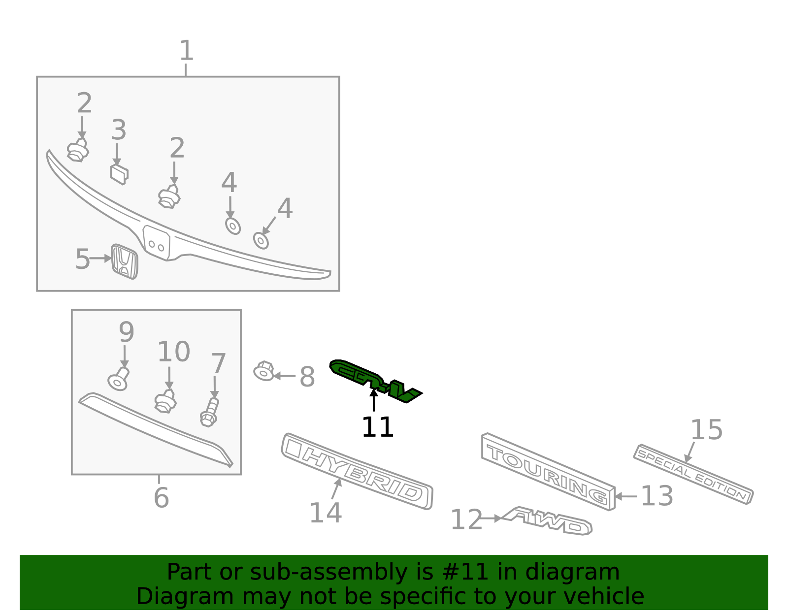 HondaPartsForLess Genuine Honda Cr-V Chrome Emblem Rear 75722-TLA-A00 2017-2022 Part can be found as # 11 in the diagram above Genuine Honda Parts Product Description Genuine Honda CRV chrome emblem Fits 2017-2022 Honda CRV (All models) Specifications Brand Honda Manufacturer Part Number 75722-TLA-A00 SKU 75722-TLA-A00 Product Genuine Honda Cr-V Chrome Emblem Rear 75722-TLA-A00 2017-2022 ONLY PART REFERENCE #11 ON THE DIAGRAM IS INCLUDED WARNING : May cause cancer and reproductive harm. See www.P65Warnings.ca.gov for more info. Dear Valued Customer Thank you for shopping with us. We will arrange the shipment ASAP. In case of any issues, please feel free to contact us first. We will try the best to help to resolve it to your satisfaction ASAP. Have a nice day.Regards, Home • Newsletter Signup • Contact Us Copyright © 2026 HondaPartsForLess , All rights reserved. Solution by RevolutionParts, Inc. :: Design by OCDesignsOnline