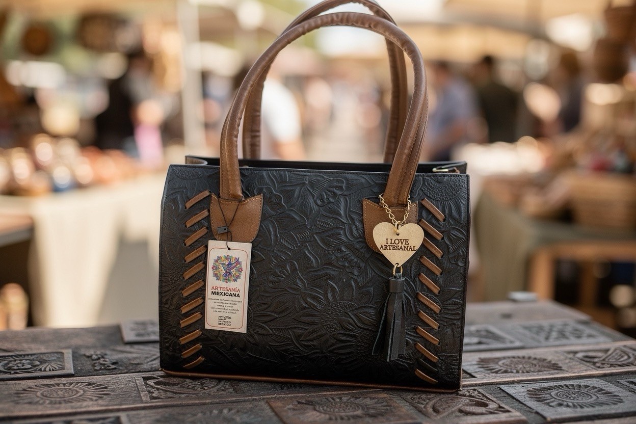 Authentic Mexican Artisan Leather Handbag – Handmade in León, Guanajuato Beautiful handcrafted handbag made from genuine leather, proudly crafted in León, Guanajuato, Mexico, a region world-renowned for its high-quality leather goods. This bag features: • Rich black tooled leather with intricate floral-style embossing • Contrasting brown leather handles and decorative side lacing • Sturdy structured design with excellent craftsmanship • Decorative leather tassel and heart charm reading “I Love Artesanal” • Original “Artesanía Mexicana” tag attached Perfect for everyday use, travel, or as a statement artisan piece. Timeless design that pairs well with casual or dressy outfits. Details: • Material: 100% Genuine Leather • Color: Black with brown accents • Origin: León, Guanajuato, Mexico • Style: Tote / Satchel / Handbag • Condition: New with tag 🎁 Makes a great gift or collectible artisan leather piece.