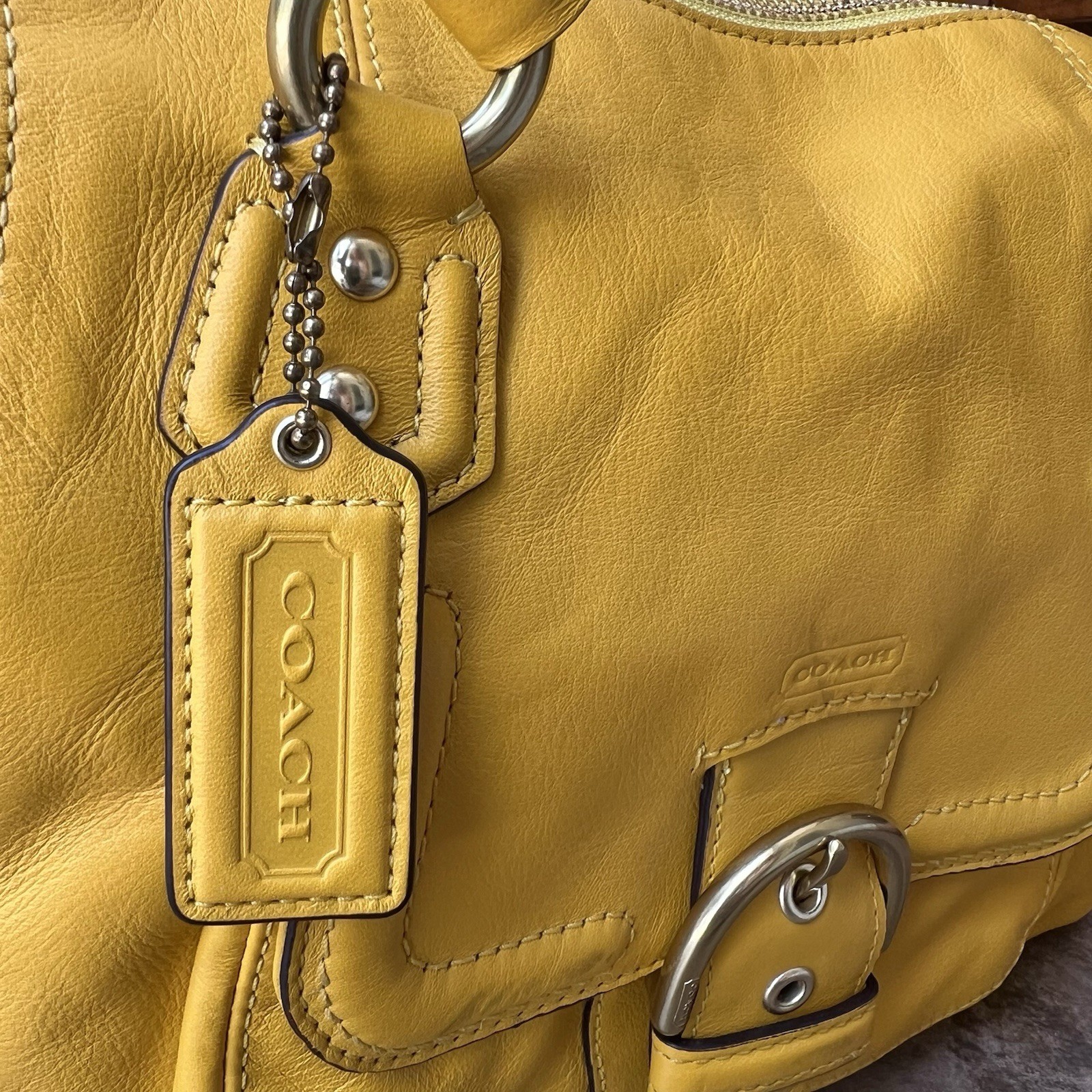 Make a bold statement with this stunning Coach Ashley satchel in vibrant yellow leather. Crafted from smooth, naturally wrinkled leather, this bag stands out with its eye-catching front buckle pocket and gold-tone hardware. Designed for both style and function, it features dual top handles and a longer shoulder strap for over-the-shoulder wear. Key Features: • Authentic Coach style F24690 • Yellow smooth leather with natural wrinkles • Gold-tone hardware with front buckle pocket • Coach embossed leather hangtag • Zip-top closure • Dual top handles and longer shoulder strap (not crossbody length) • Interior zip and slip pockets • Approximate dimensions: 14” W x 10” H x 5” D • Serial number: L1373-F24690 Condition: Very good pre-owned condition. Leather shows soft wrinkling and some indentations on the front (visible in photos). Minimal wear on the interior. A well-loved piece with plenty of life left! I accept returns within 14 days of delivery; however, the buyer must contact me within 3 days of receiving the item. If there is any problem or the item is not as desired, please reach out to me first. The buyer is responsible for return shipping costs and must provide tracking information. A full refund will be issued once I receive the item in the same condition it was sent. I do my best to take accurate pictures, but please note that colors may appear different in real life due to lighting and screen settings. I strongly urge buyers to check the provided measurements and compare them with their own before purchasing to ensure a proper fit. The item is not visibly worn or unclean, but I do not launder pre-owned clothing before shipping. I recommend following the care instructions on the label upon receipt. I do my best to remove any lint, but a few stray fibers may still be present.