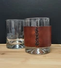 Custom Leather glass sleeve handcrafted with top grain leather. Available in natural, bridle, light and dark brown, mahogany or black. Hand stitched to firmly fit with a comfortable feel. Slides on and off for convenient washing. Personalize your sleeve with a monogram. Choose your borders. Order a single glass with sleeve or get a pair. Beautifully wrapped. Don't want a monogram? No problem, message me for more information.