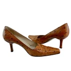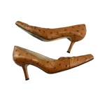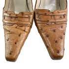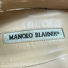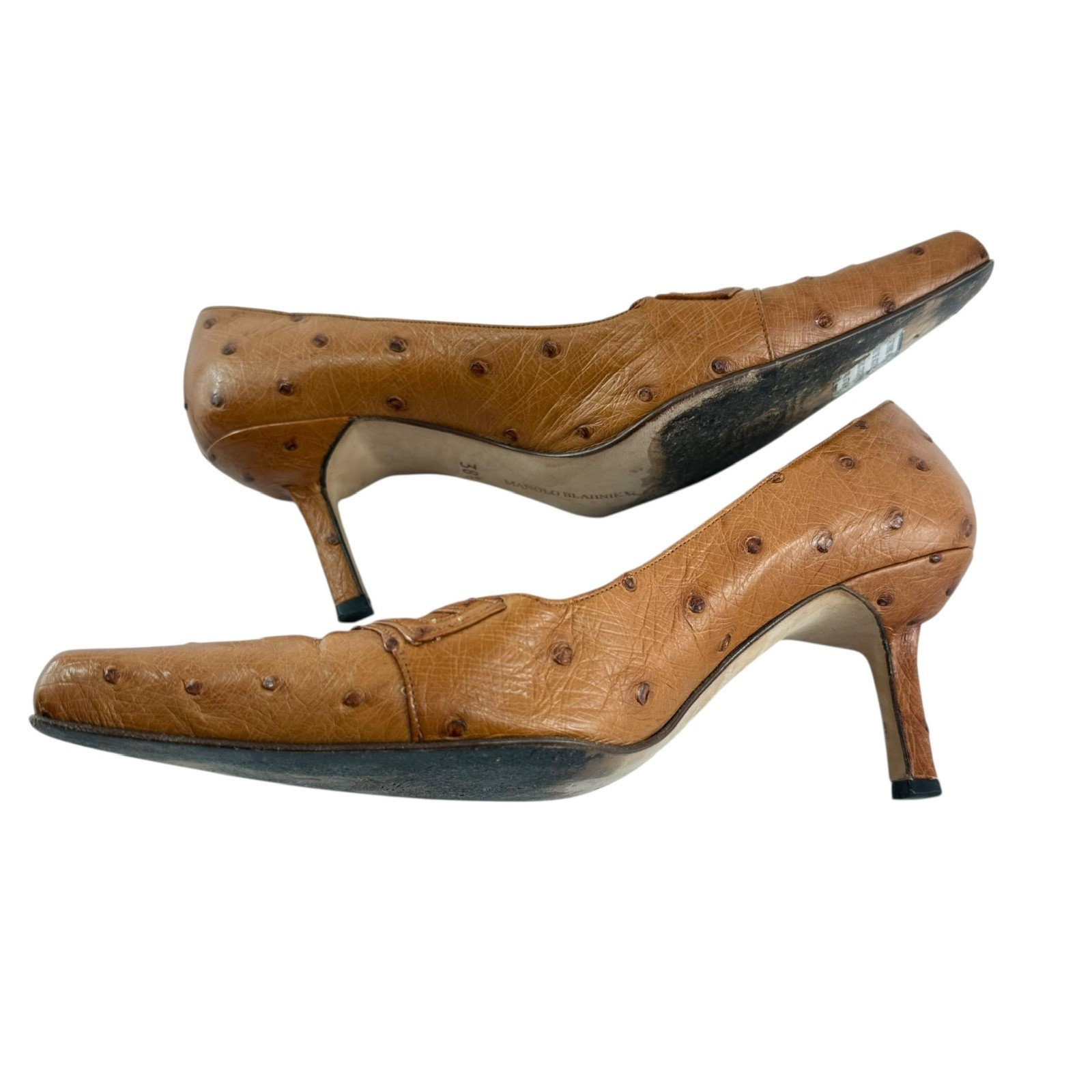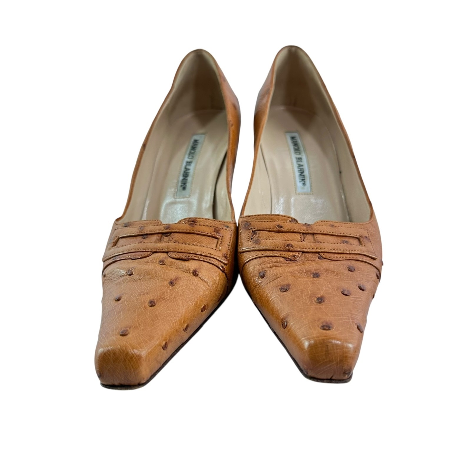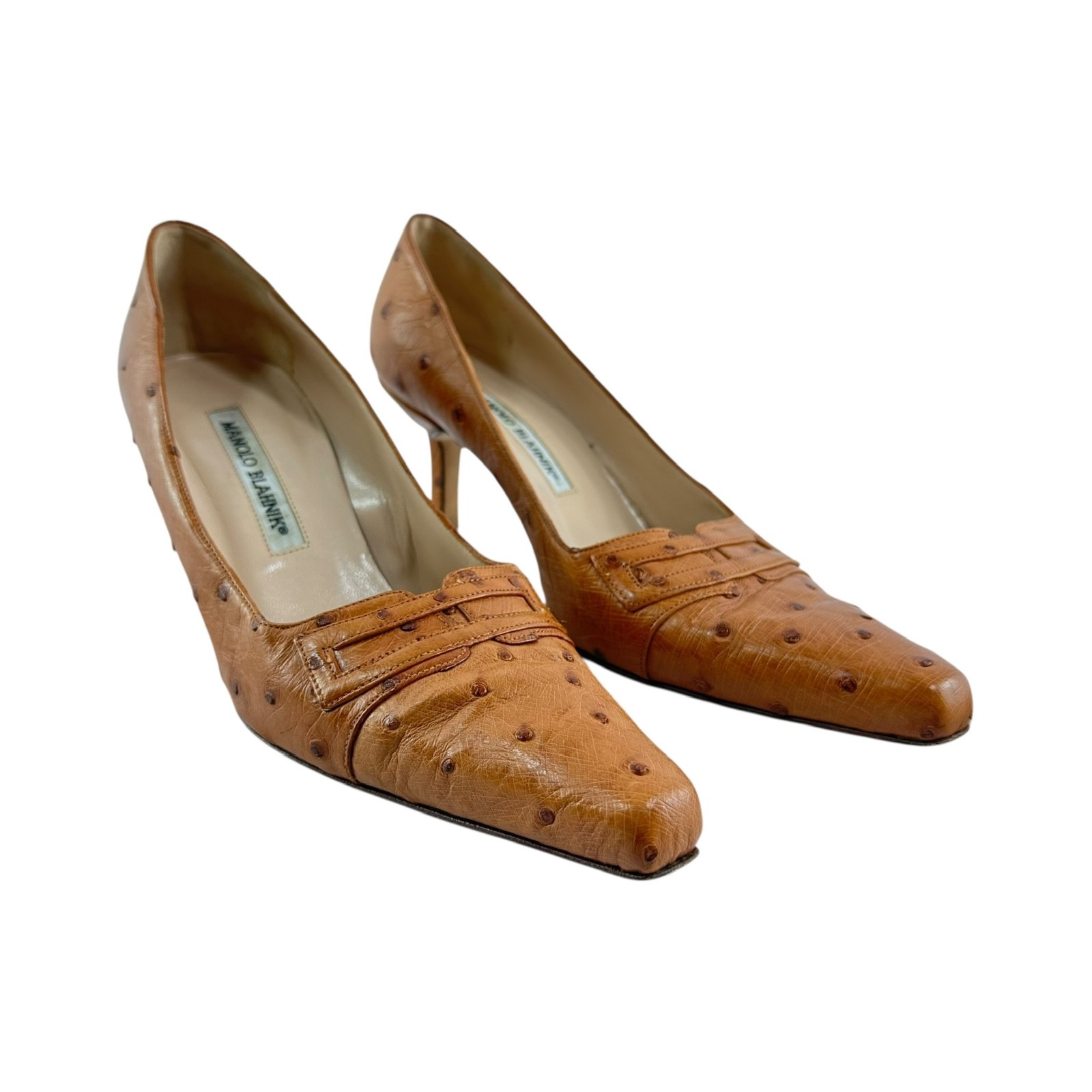 Lovely ostrich heels by Manolo Blahnik. Lined in soft leather with leather under soles. Shoes measure 3"1 at its widest base and 2"5 heel. Shoes are not new and look amazing with no tears and are made of lovely tan ostrich skin. 100% genuine Manolo Blahnik made in Italy US size 8.5. I SHIP WORLDWIDE I want to stress that item is vintage which means it's not new. All my customers are very important to me and I believe communication is very important. I do not sell or encourage any one to sell fakes. I do gladly combine shipping and items returned to me by the post office will be charged additional postage upon being reshipped. Any questions please email me and I will be more than happy to answer all your questions. No refunds. Contact Items are sold as is and if you have an questions please let me know before you purchase item. Shipping Shipping is done with USPS priority mail within the U.S. and shipping takes 4-5 business days from the date of payment. Please note I do combine shipping. If you have any questions please feel free to email me.