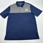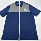 This is a men's large New York Yankees polo shirt featuring a multicolor graphic print. It is genuine merchandise from Major League Baseball (MLB) with a design that showcases team pride. The shirt is made in Egypt and is perfect for any baseball fan looking to show support for the Yankees in style. *Check the images above for the flaws and measurements of the item.