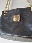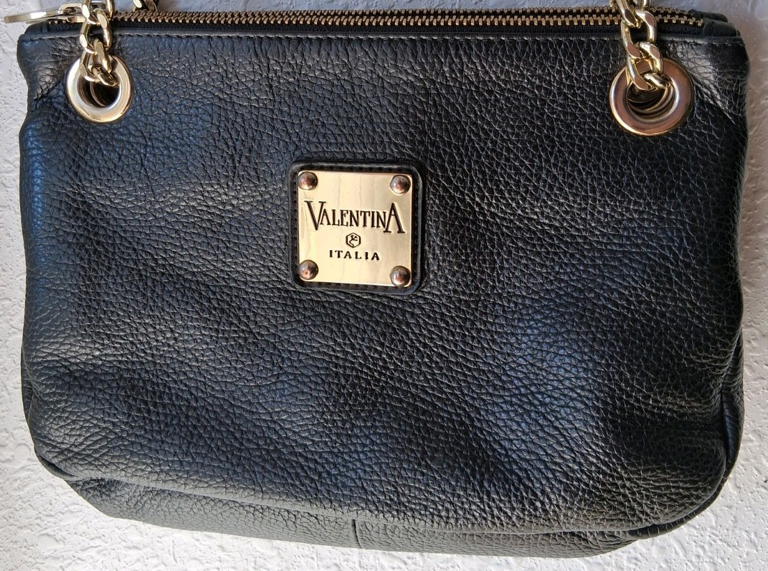 Flaws include: tear in one of the inside pockets, light wear, and some fading from the gold straps (**All shown in photos**) This Genuine Black Leather Vtg Valentina Women's Shoulder Bag with Gold Hardware Straps is a stylish and classic accessory perfect for casual occasions. Made in Italy, this small-sized bag features a pebbled black exterior with a magnetic closure and black leather straps. The bag also includes inner pockets, a beige leather lining, and a solid pattern. The timeless design and designer brand Valentina make this shoulder bag a must-have for any woman looking for a sophisticated and fashionable handbag.