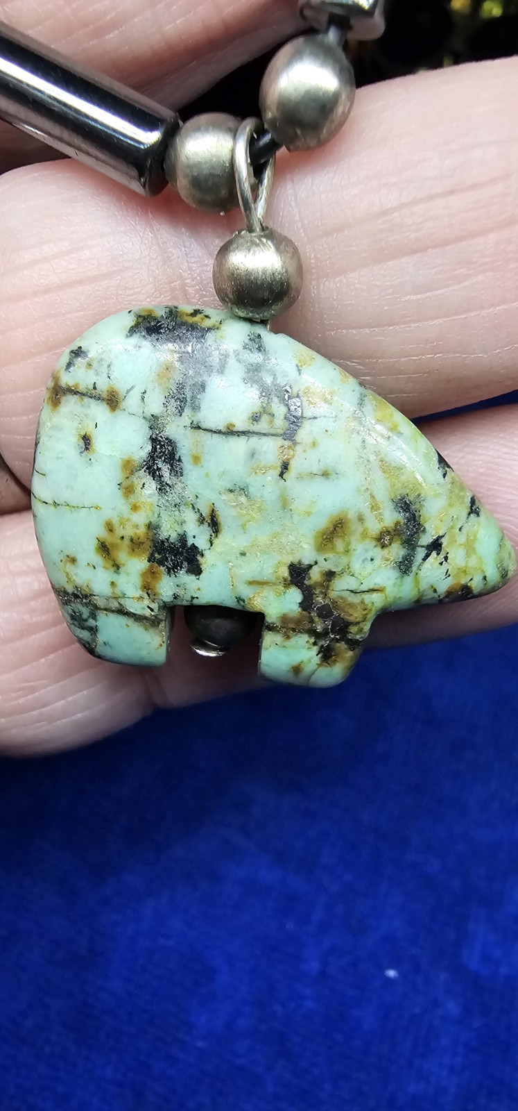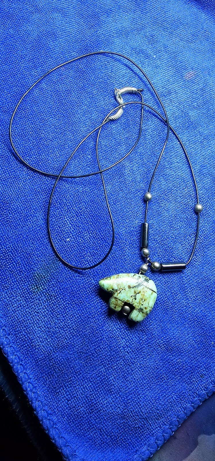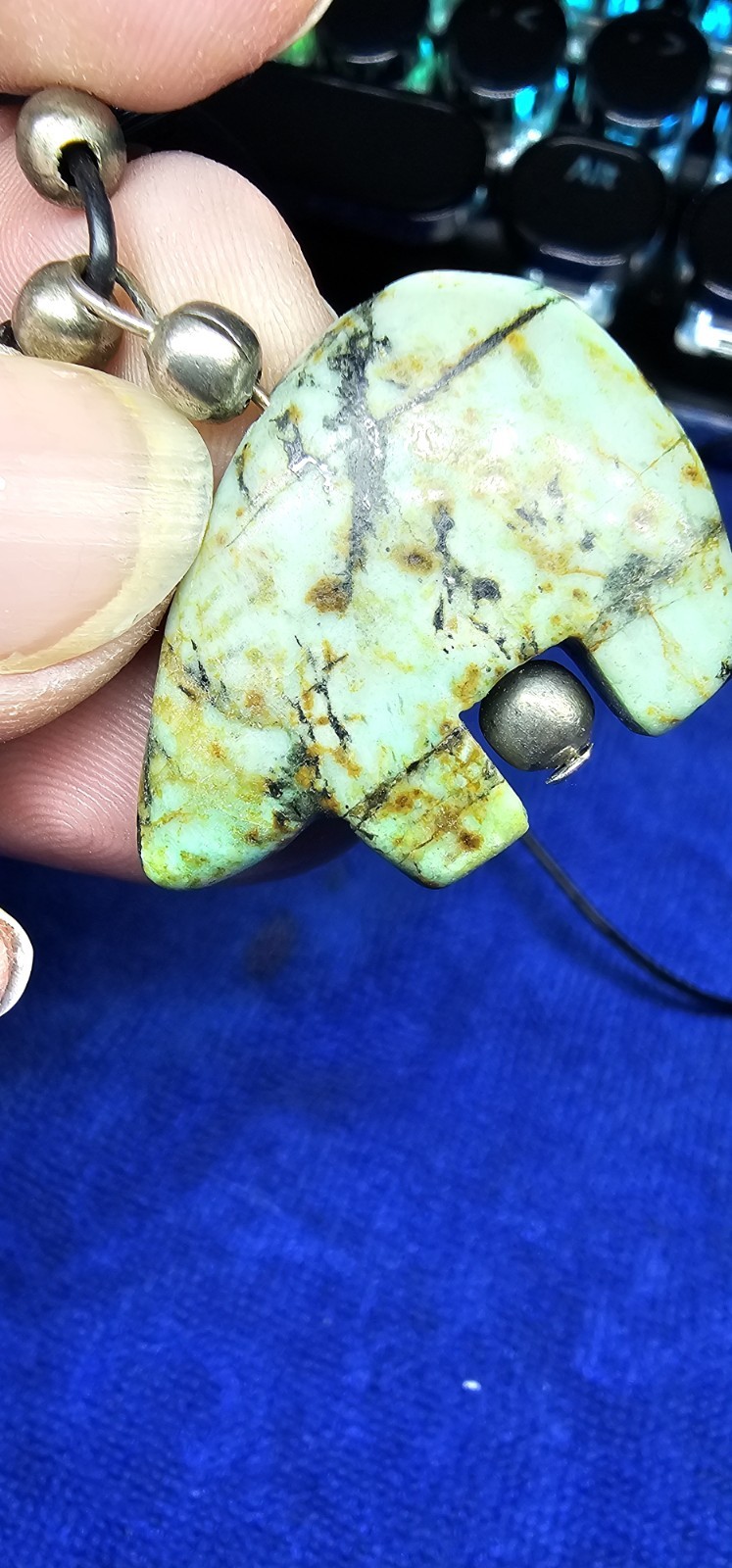 This handcrafted necklace features a genuine turquoise bear fetish pendant, symbolizing strength and healing in Native American tradition. The turquoise is cold to the touch, resists scratching, and shows a natural waxy matrix—signs of authentic, untreated or lightly stabilized turquoise. The bear is strung on a 15.5" drop cord (31" total length) with hematite-style barrel beads and brass-tone accents, creating an earthy, tribal aesthetic. Perfect for collectors of Southwestern or symbolic jewelry. 🔹 Authentic turquoise (tested, not dyed or composite) 🔹 Hand-carved bear with natural matrix 🔹 15.5" drop — great layering length 🔹 Spiritual and meaningful design --- Item Specifics: Condition: Pre-Owned Main Stone: Genuine Turquoise Stone Shape: Carved Bear Fetish Material: Turquoise, Brass-Tone Beads, Hematite-Style Barrel Beads, Black Cord Color: Green-Blue with Natural Matrix Pendant Size: Approx. 1.5" wide Necklace Length: 15.5" drop (approx. 31" total length) Closure: Slip-on (no clasp) Style: Tribal / Boho / Native American-Inspired Artisan Made: Unknown Country of Origin: Likely USA or Southwest Region